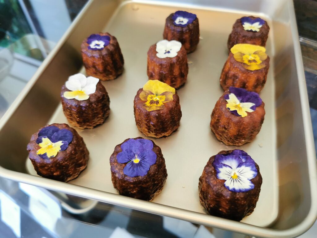 メインのカヌレですが、米をを使ったグルテンフリー。 味はプレーン、ジンジャーオレンジ、チョコ、ほうじ茶の4種でお値段は各380円。 味別にエディブルフラワーの種類も変えており、かわいい上に機能的。 詰め合わせにして手土産などにすると喜ばれそうです!