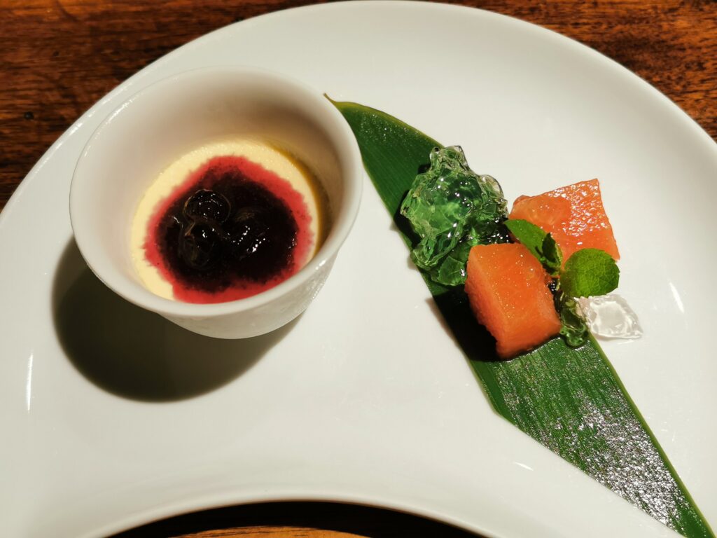 <甘味> ・クリームチーズのプリン ・スイカと熊九ゼリー ・カモミールティ