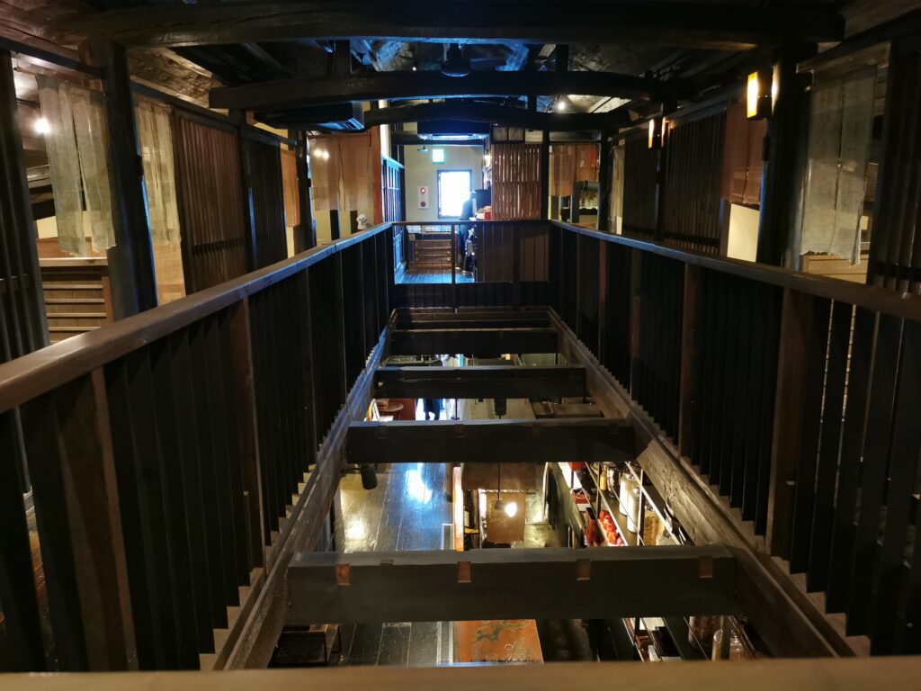 案内されたのは2F。こちらは小部屋に分かれており、明治時代までここでお酒を造っていたそう。 少し薄暗い雰囲気で柱もそのまま生かされており、目を閉じると職人さんたちの息遣いが聞こえてきそう。