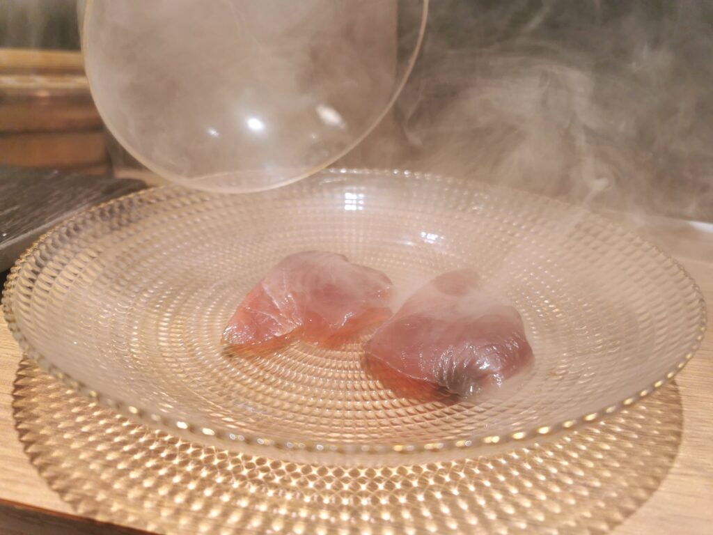 お料理と握りのボリュームはバランスよく、旬の食材を堪能することができました。 握りのシャリは赤酢系でさっぱりとしたタイプ。サイズも小ぶりでお酒のアテとしてもすごくよかったです。 お料理のカツオのスモークは演出も楽しめ、スモーキーな香りのついたカツオが一工夫あって好みでした。