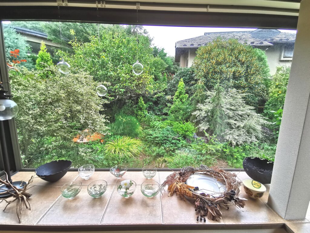 大きな窓から見える風景は、自然のアートのよう。 食器などの可愛い小物たちもセンスがよく、自然とアートが融合していますね。