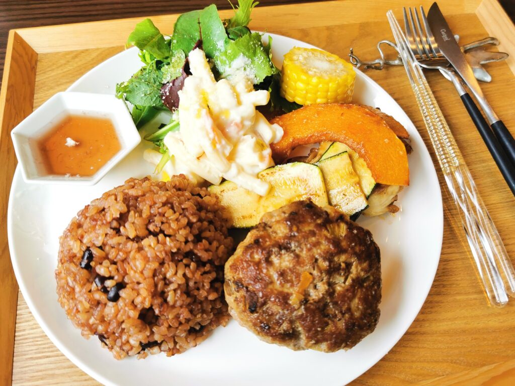 この日私がランチでいただいたのは「ハンバーグ1430円」。 ワンプレートにハンバーグ、五穀米、グリル野菜、サラダ、マカロニサラダがぎゅっとまとめられています。 しっかりとしたボリュームで食べ応えも十分。