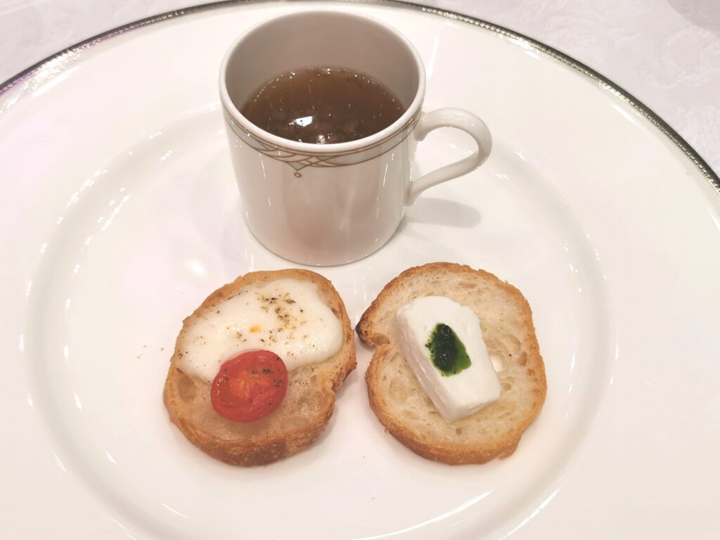 川上牧場のリコッタチーズとモッツァレラチーズのオーブン焼き バゲット添え 淡路産たまねぎのスープ
