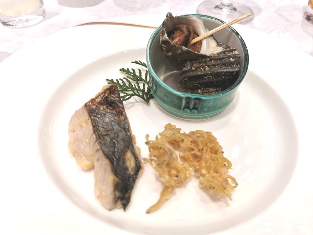 サワラの味噌焼きとサザエのツボ焼き 淡路産ちりめんじゃこのつまみ揚げ (淡路旬菜鮮魚 花光)