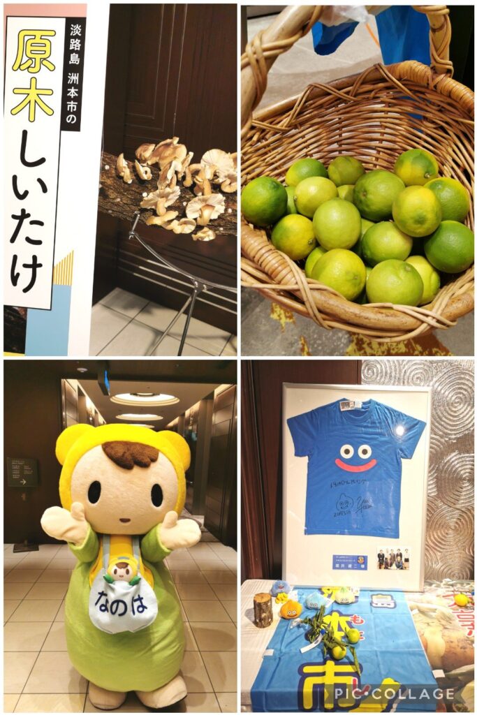 会場には原木シイタケや子育てキャラクターの「なのは」ちゃん、洲本市出身の堀井雄二氏のサインやスライムなど、感謝イベントを盛り上げておりました。