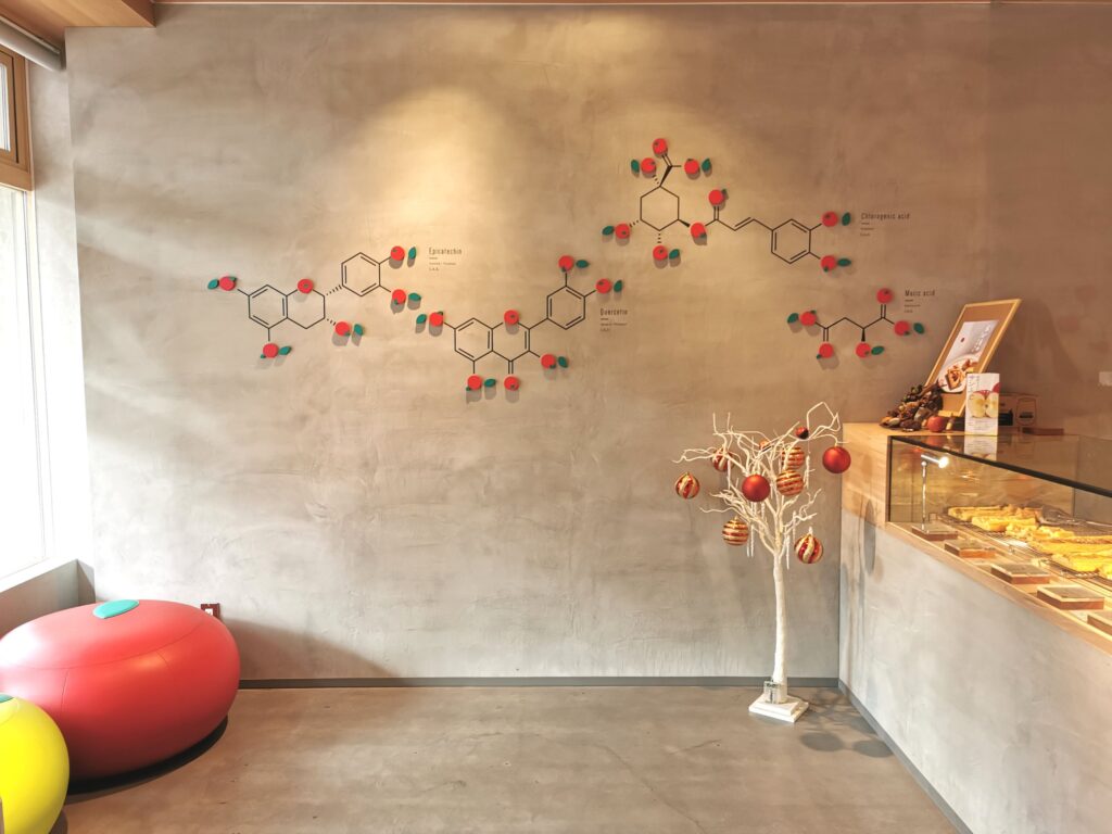 店内は打ちっぱなしの壁と広々とした空間。 ところどころにリンゴをデザインのものがあり、とてもおしゃれで可愛らしい。