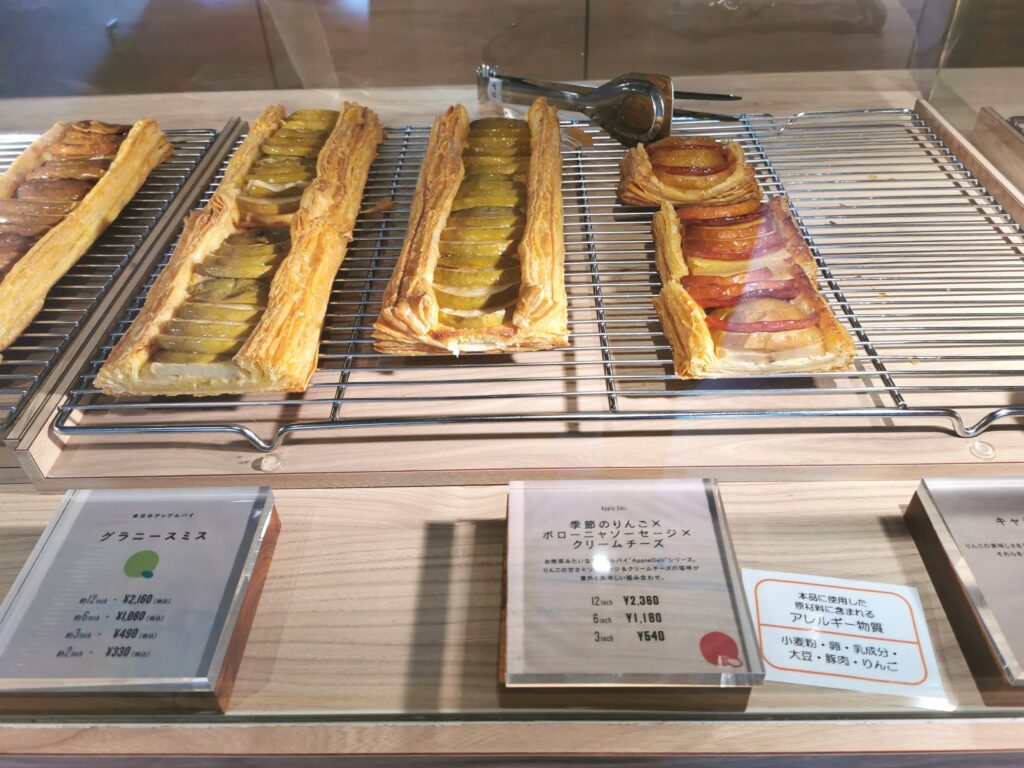 グラニースミス、季節のリンゴ×ボローニャソーセージ×クリームチーズ、季節のリンゴ×キャラメル(まだ陳列されておらず)。