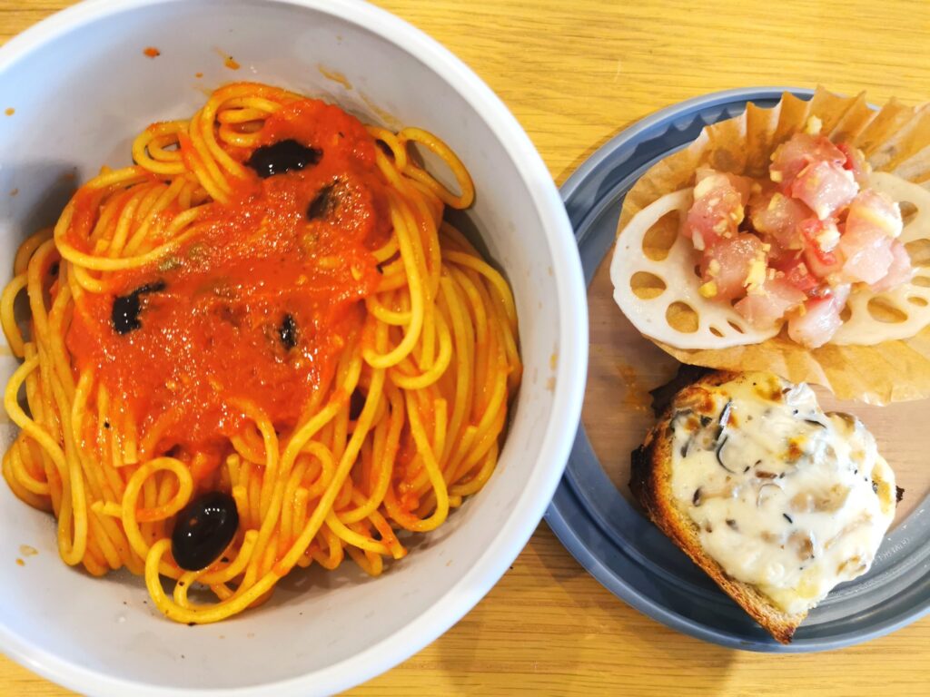 しっかりとした容器に前菜とたっぷりのパスタが入って1000円。 もちろん食べ終えた後は容器を指定の場所に返却します。