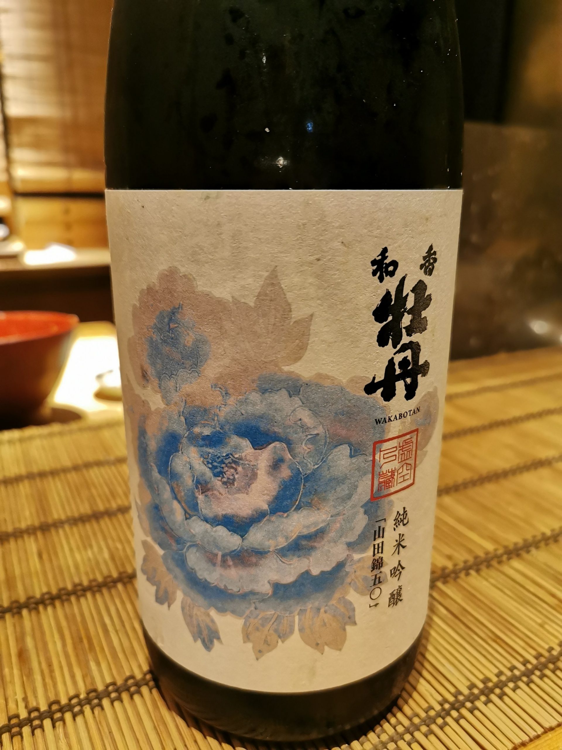 **和香牡丹純米吟醸 山田錦50 **穏やかな香りと、山田錦由来のふくらみのある旨味。 ラベルも美しい日本酒。
