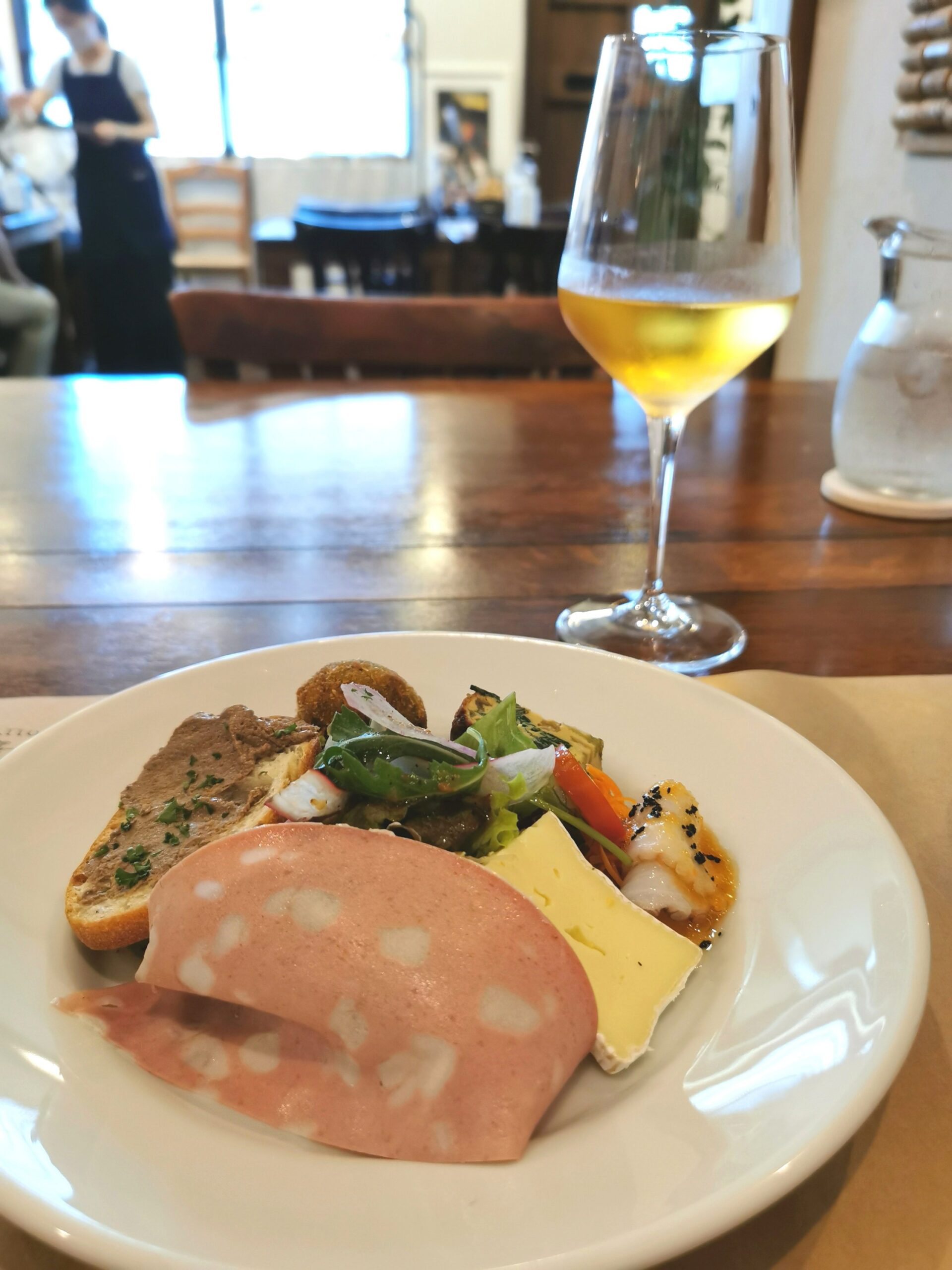 まずは前菜。センターにサラダ、その周りを囲むようにライスコロッケ、チーズ、カルパッチョ、ハム、フリッタータ、レバーパテなど、ワインのアテにちょうど良いお料理。