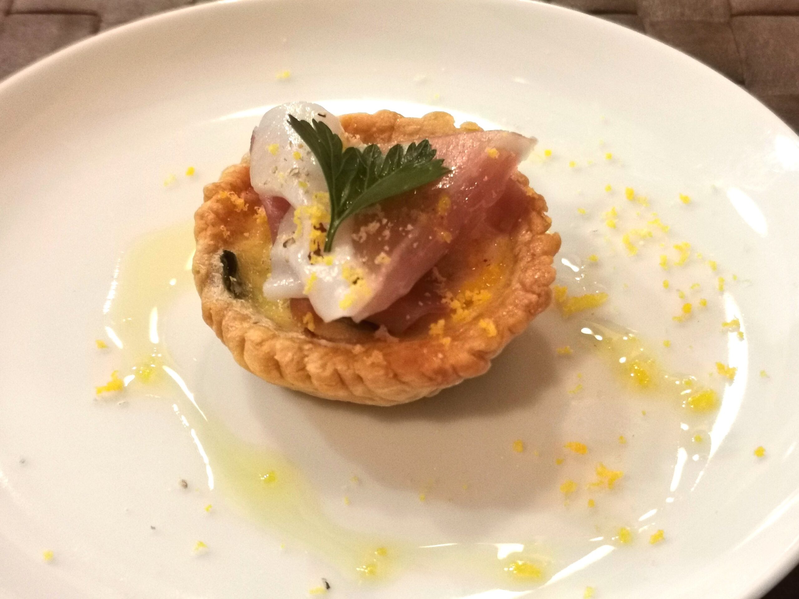 アミューズは一口サイズのミニキッシュ。ネギの甘さとゴルゴンゾーラ、プロシュートの塩味が心地よい。 スパークリングワインと合わせていただきました。
