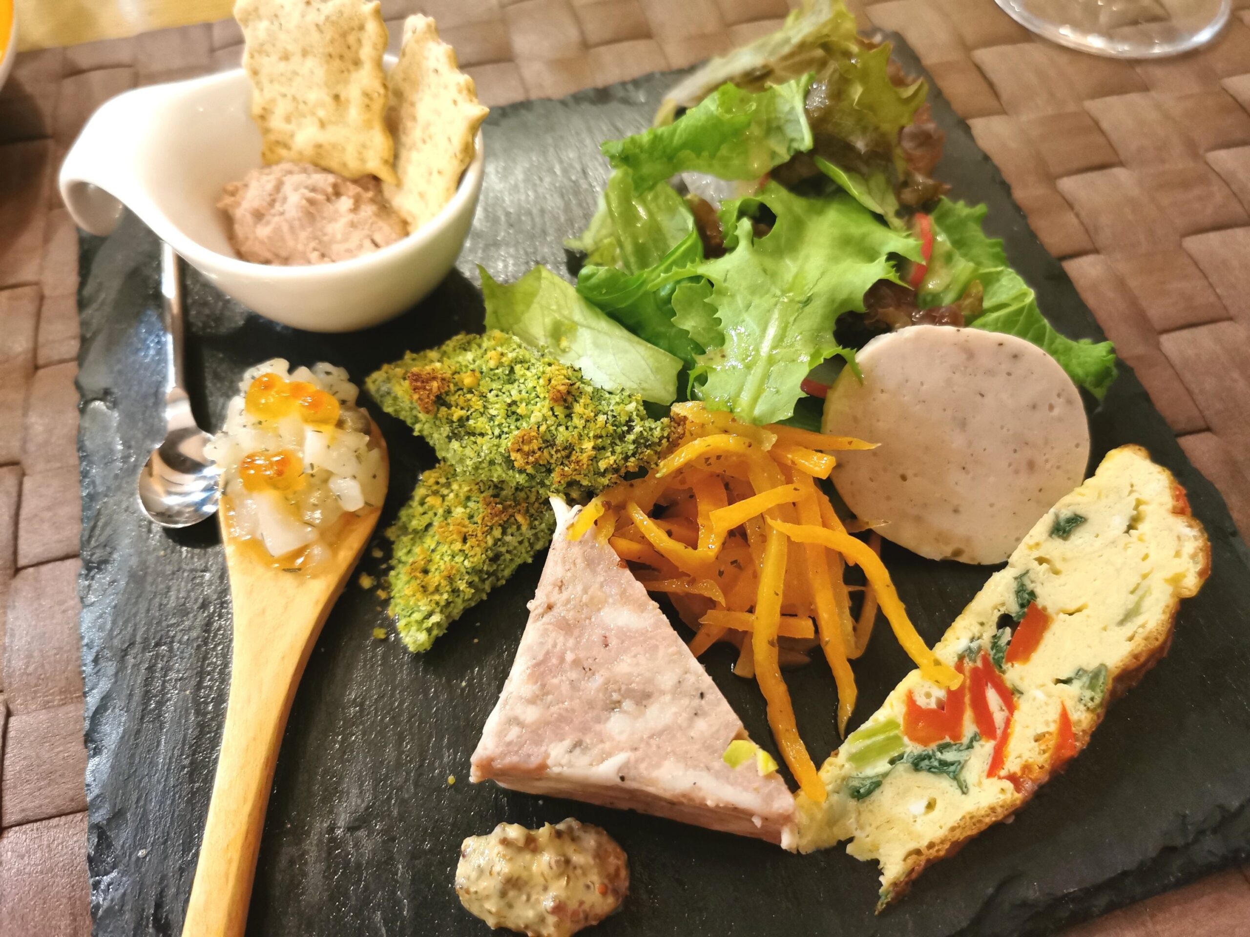 パテカン、リエット、フリッタータ、ホタテのタルタル、キャロットラペ、グリーンサラダなどいろいろ盛り合わせた一品。 どれもワインのアテにピッタリ!