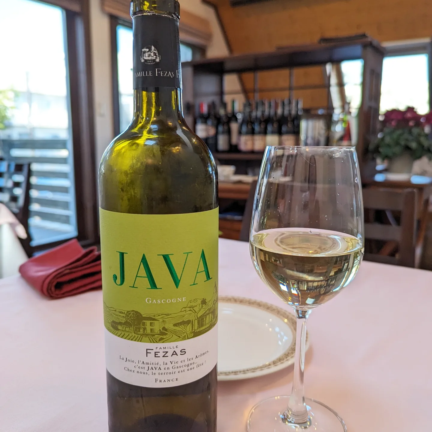 フレンチといったらやはりワインもつけたい。 この日はランチにピッタリのシュッドウエストの白「Domaine Chiroulet Java Gascogne Blanc」をボトルでいただきました! ブドウ品種はコロンバール、ユニ・ブラン、ソーヴィニヨン・ブラン。 華やかな香りとまろやかな口当たりがランチにぴったりです。
