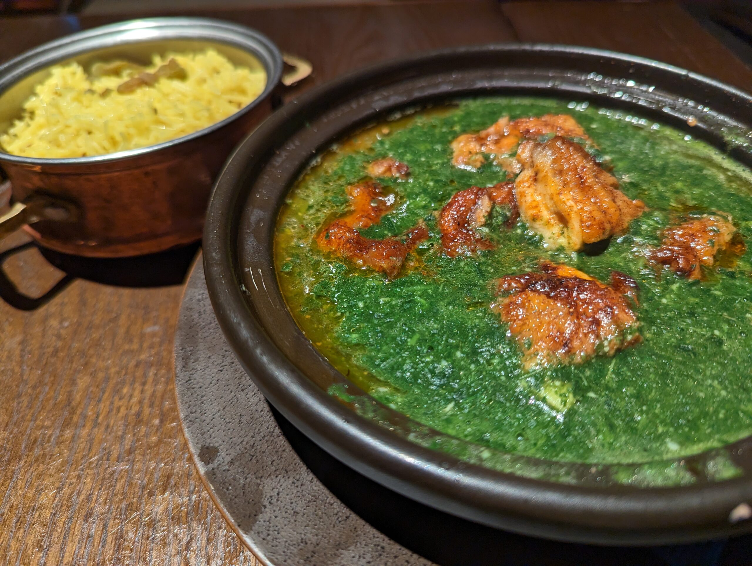 モロヘイヤ独特のトロトロのスープにグリルしたチキンが入っています。付け合わせのバスマティライスと合わせていただきます。