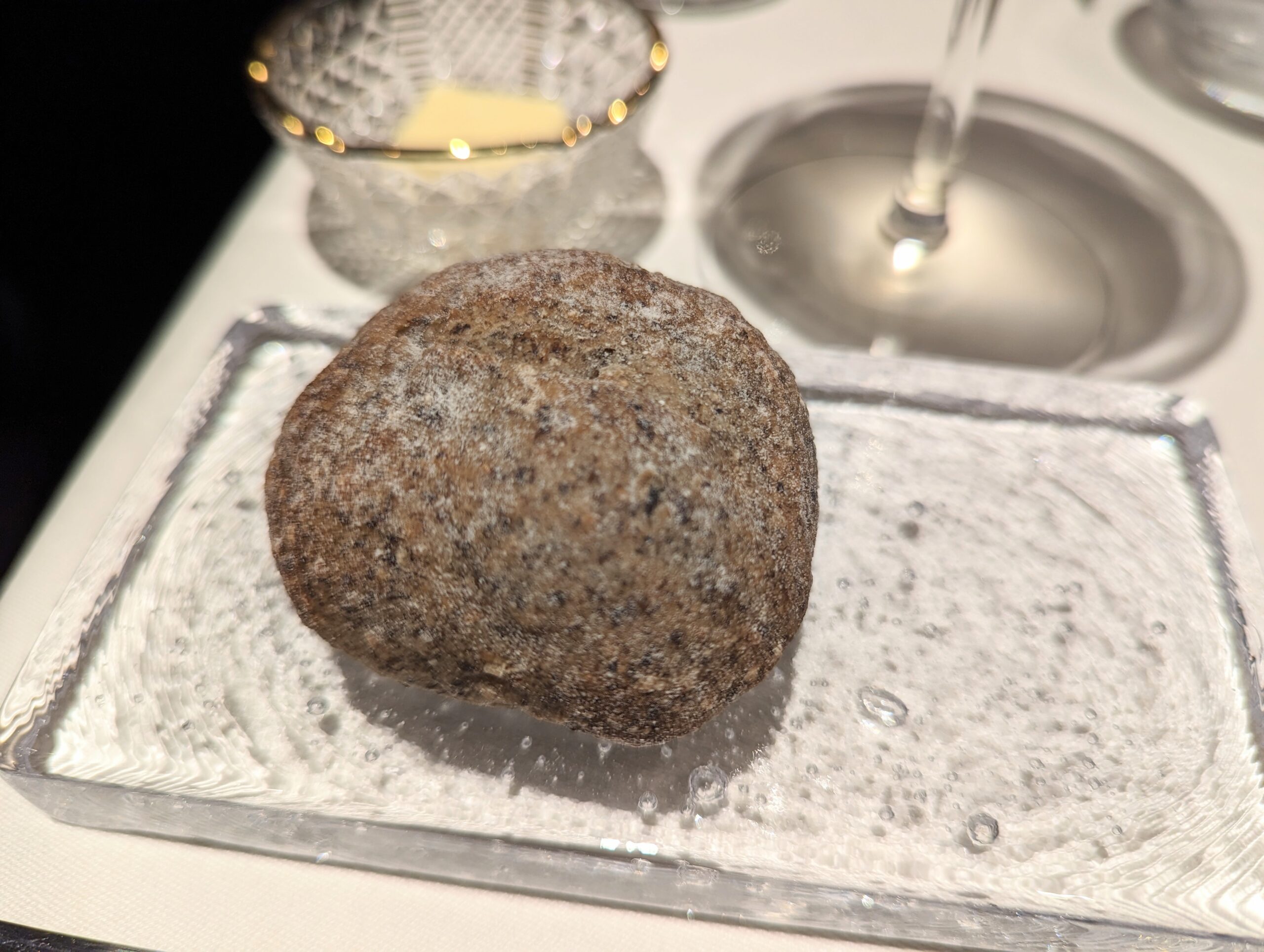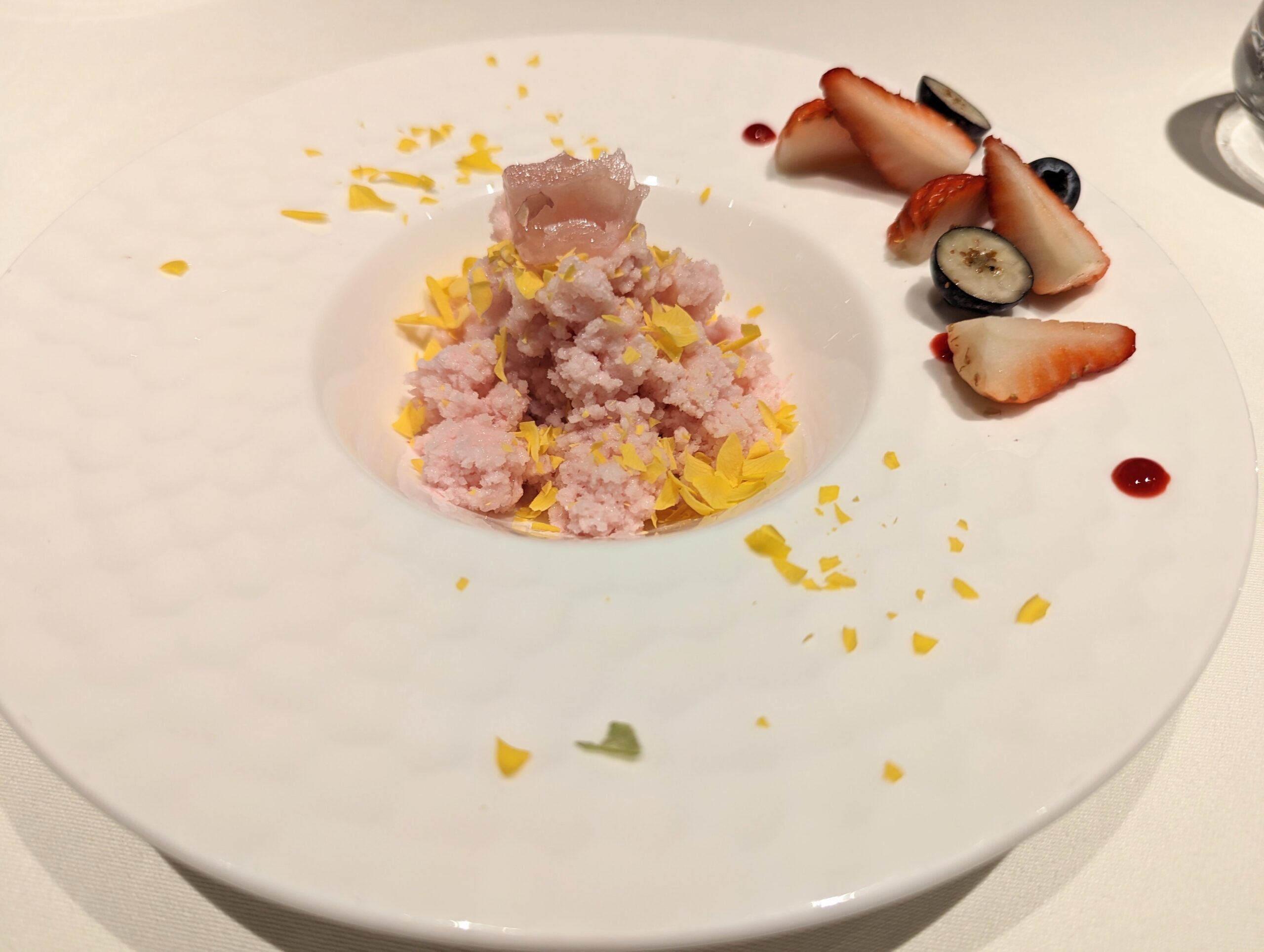 Dessert バラとヨーグルトのグラニテ デザートはパティシエ自らサーブ。生食用のバラの花を液体窒素で瞬間冷凍して、グラニテにかけてくれます。 ピンクの琥珀糖もアクセントで可愛い。テンションの上がるデザートですね。