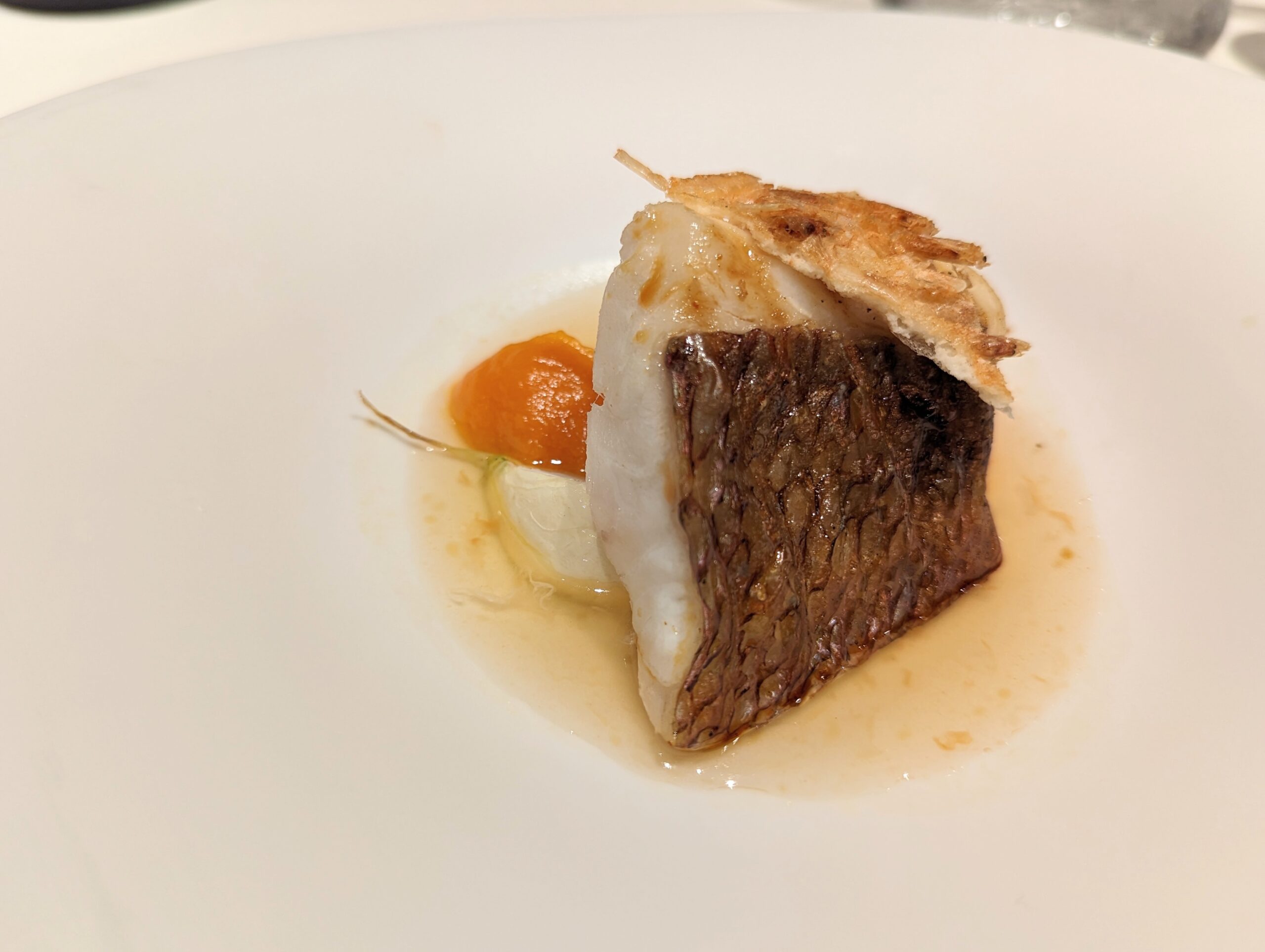 Poisson 真鯛 人参と桜エビ 発酵チェリートマトのスープ仕立て スープとともに真鯛を味わうもよし、発酵トマトのソースで味にアクセントをつけるもよし、そしてぱりぱりの皮目の香ばしさを楽しむもよし、味の変化を楽しめる素敵な一皿。