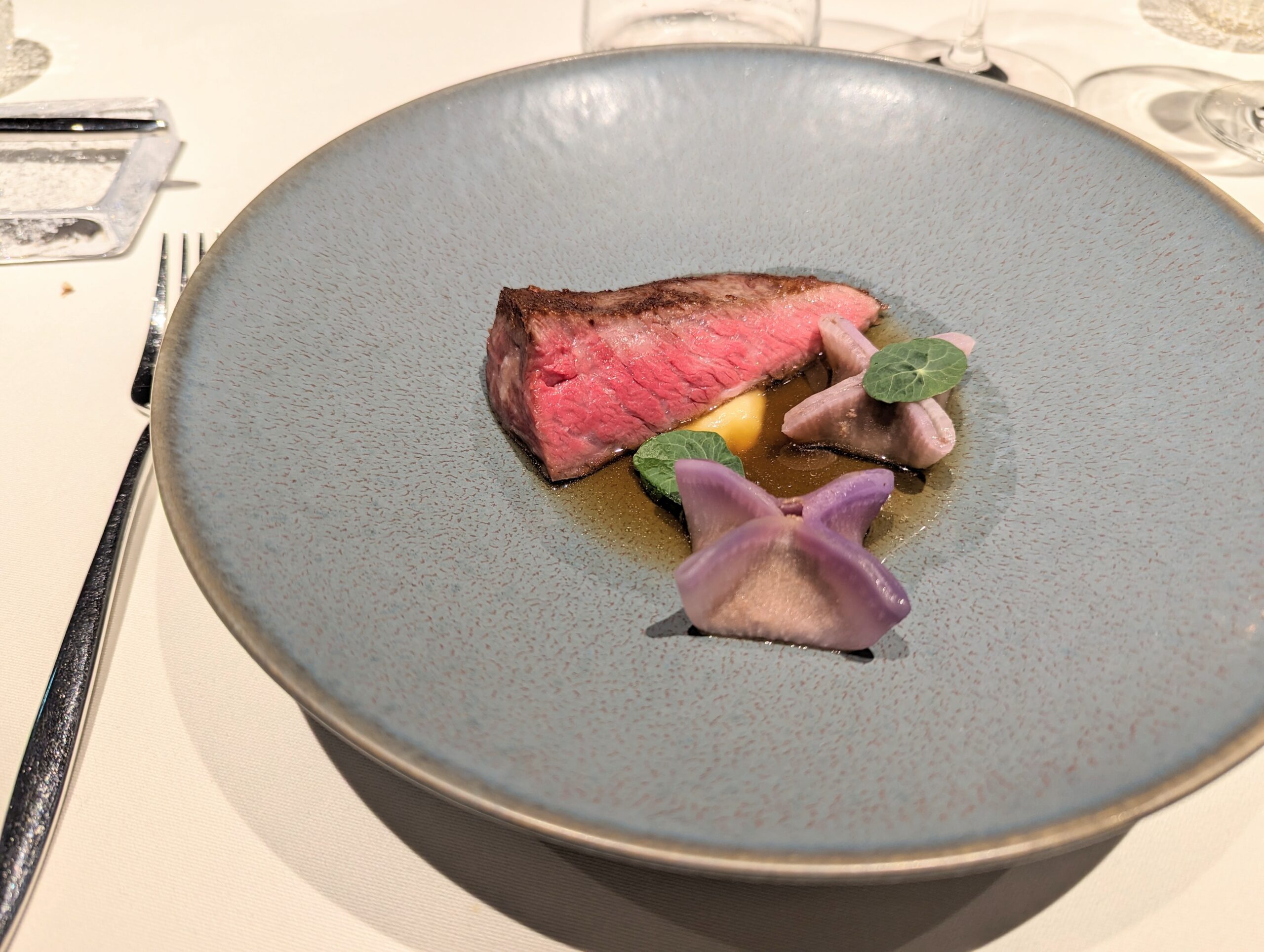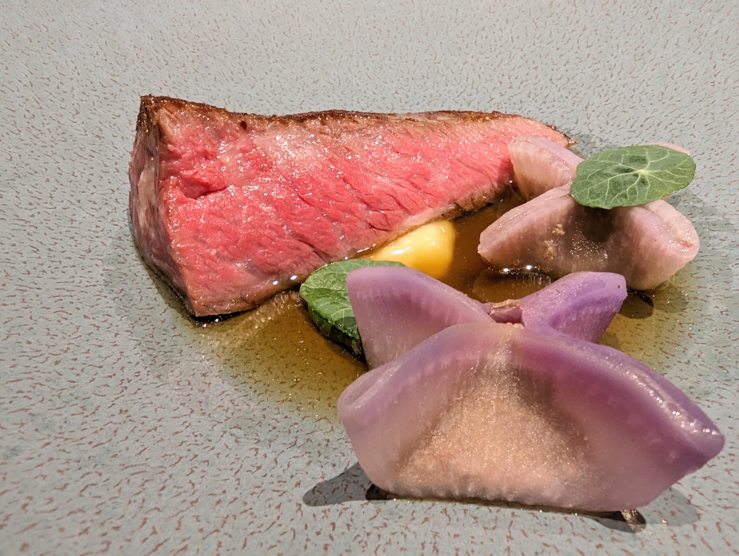 Viande 岩手県産黒毛和牛フィレ肉 コンソメ仕立て フレンチのお肉というと、少し重いイメージがあったのですが、お肉をコンソメでいただくので、想像以上にさっぱりといただけます。とにかくお肉が上質なので、シンプルにお肉のうまさが引き立ちますね。 付け合わせの大根のラビオリのようなものも秀逸。