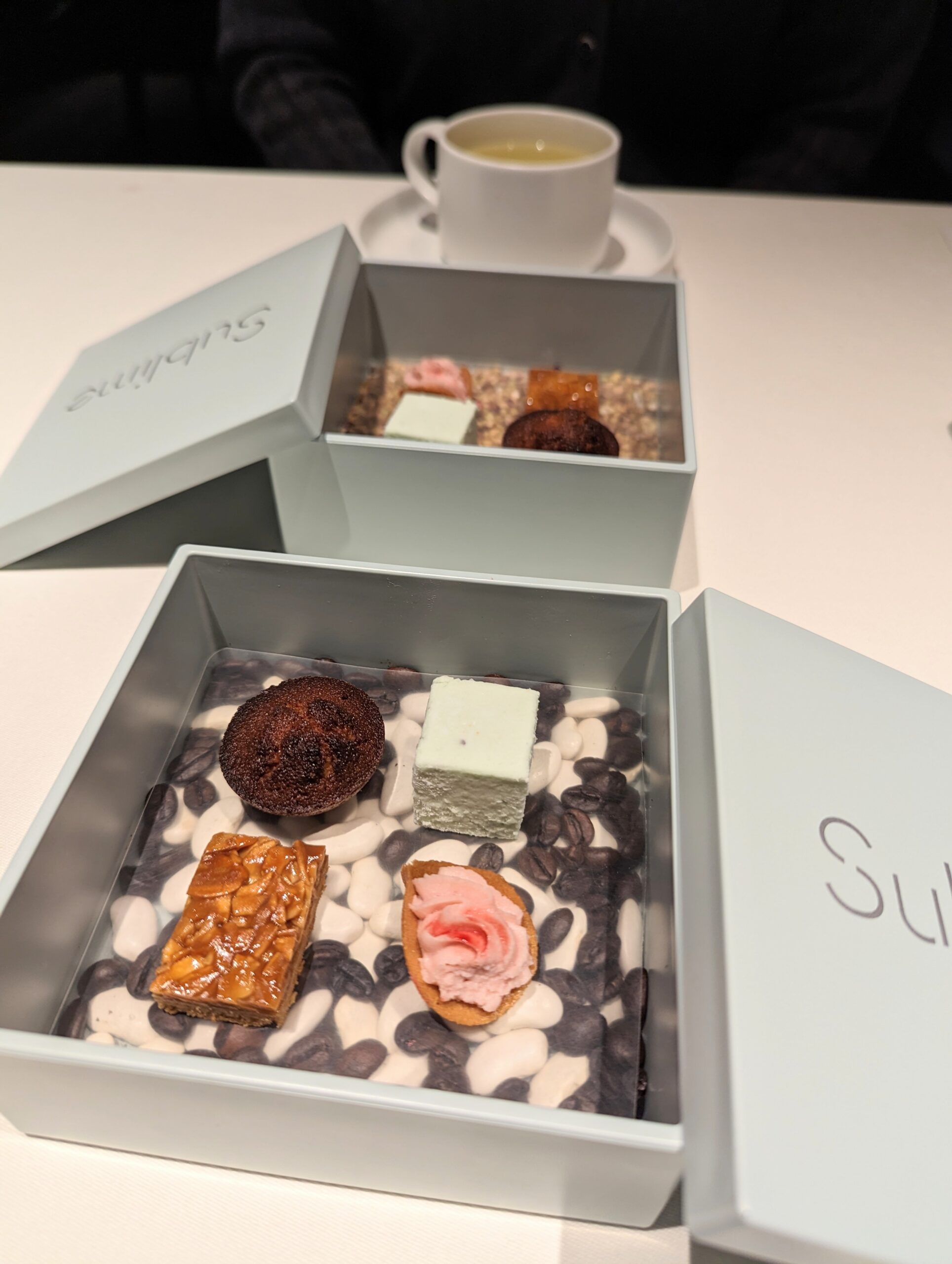 食後の飲み物 小菓子 可愛い小箱を開けると、フィナンシェにキウイのギモーヴ、フロランタン、苺のラングドシャが入っていました。 最後のお菓子まで手抜きなし。