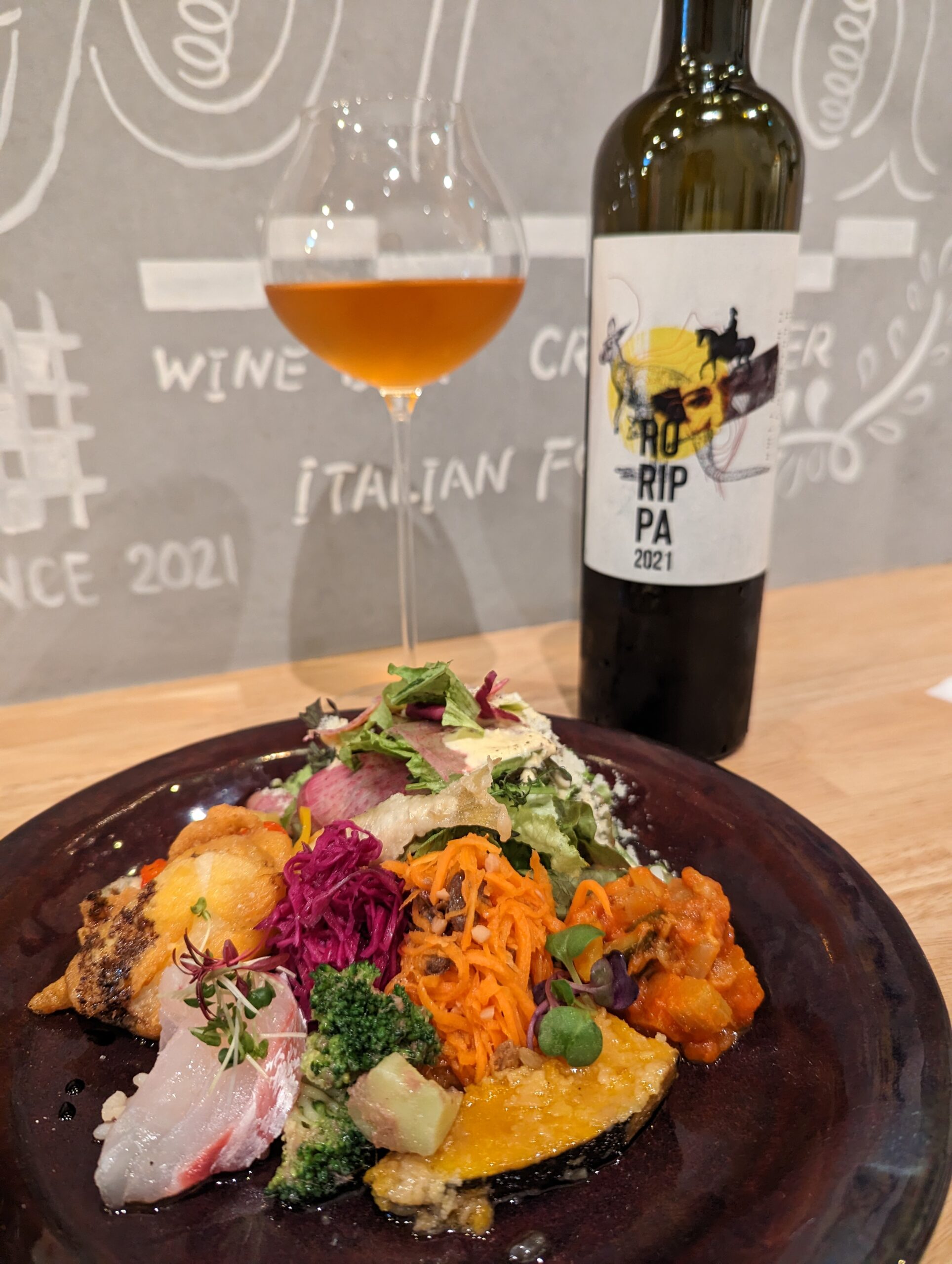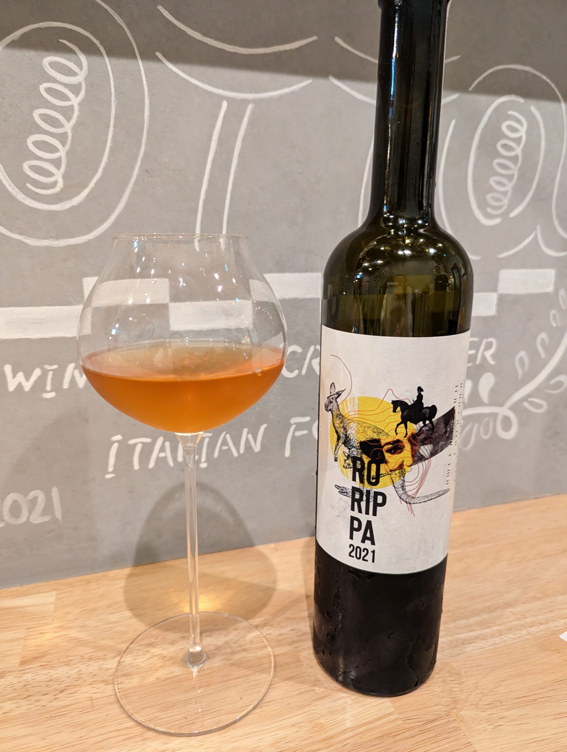 お店の方おすすめの、 「RORRIPA ロリッパ・イタリア エミリアロマーニャ」にしました。 品種 : シャルドネ90% マルヴァジア10%とシャルドネ主体のオレンジワインです。