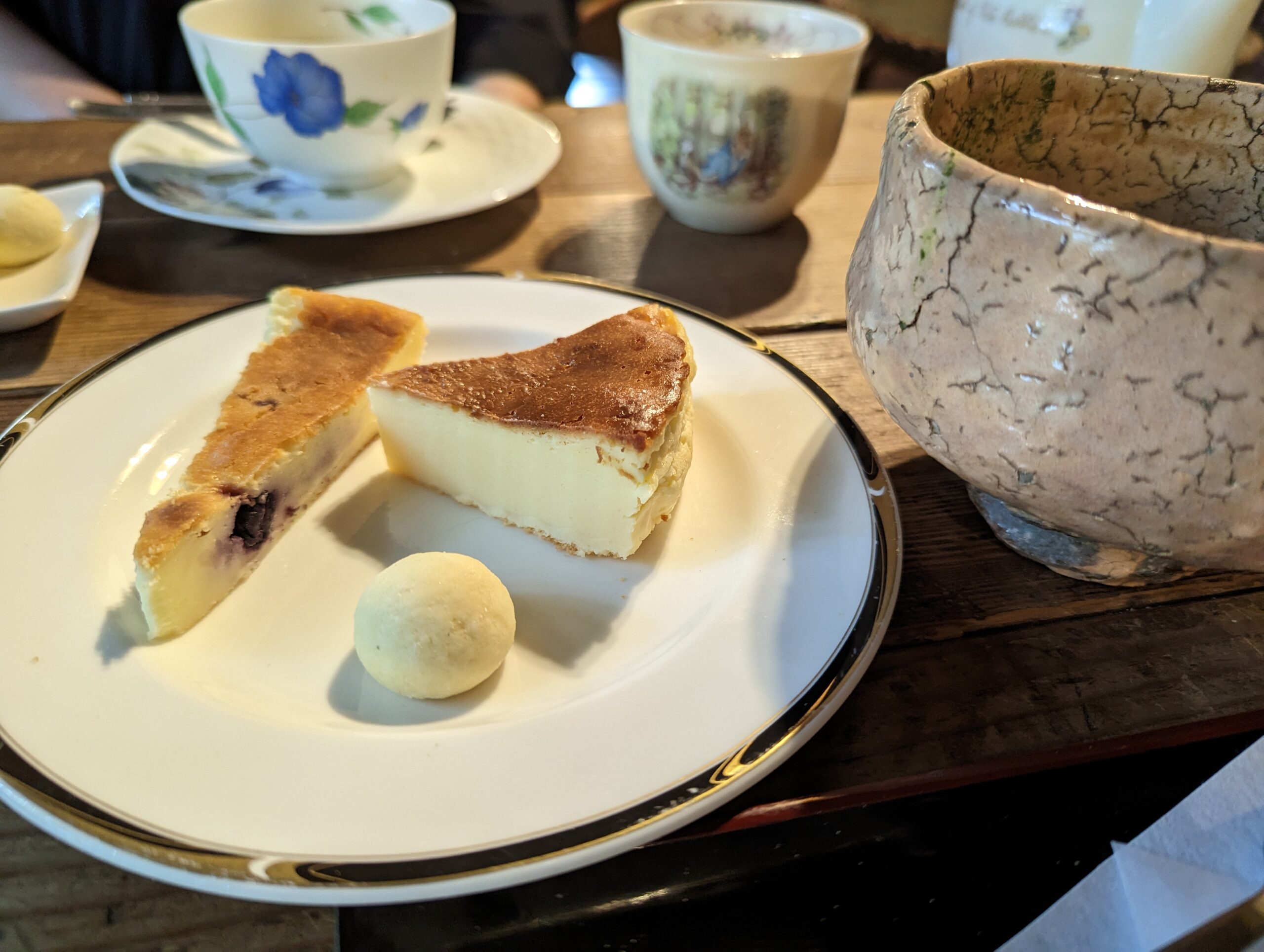 チーズケーキと抹茶のセットをいただきました。 出てきたのはチーズケーキは2種類とスノーボールクッキー、そして本格的な抹茶。 優しい味のスイーツはどこかほっとします。 これで300円は驚きですね。