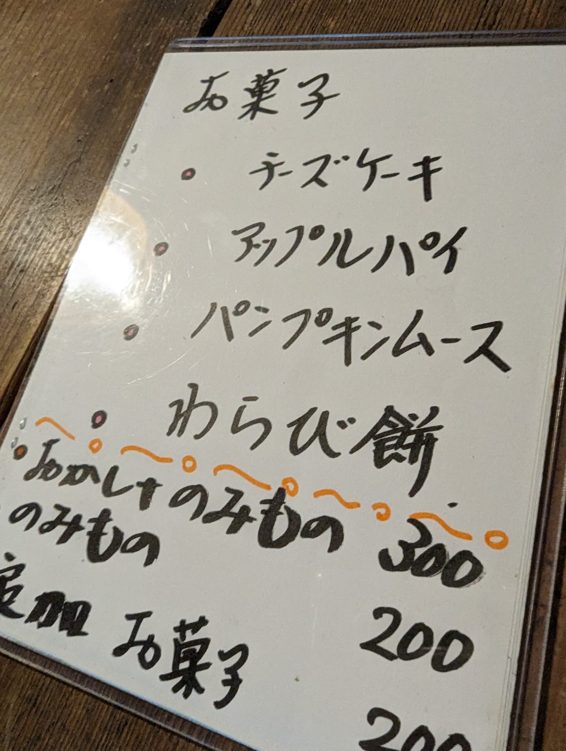 メニューを見ると スイーツはチーズケーキ、アップルパイ、パンプキンムース、わらびもち、 飲み物はコーヒー、紅茶、フレーバーティー、抹茶、ほうじ茶、オレンジジュース、アップルジュースから選べます。 セットで300円、やはり外の看板の値段はそのままでした。