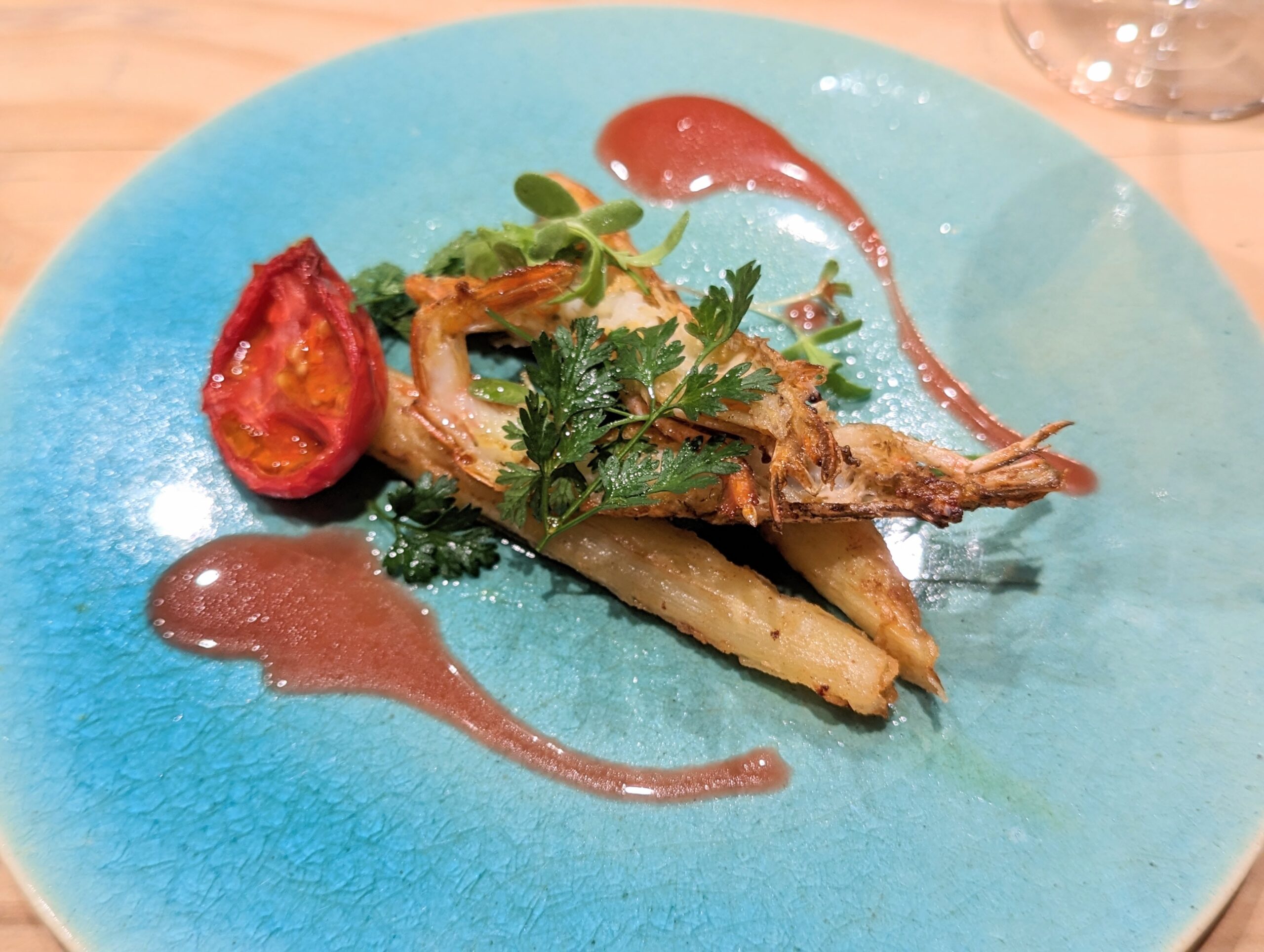 お料理名は忘れたので、写真をメインに備忘録で。 ホワイトアスパラとえび、トマト。