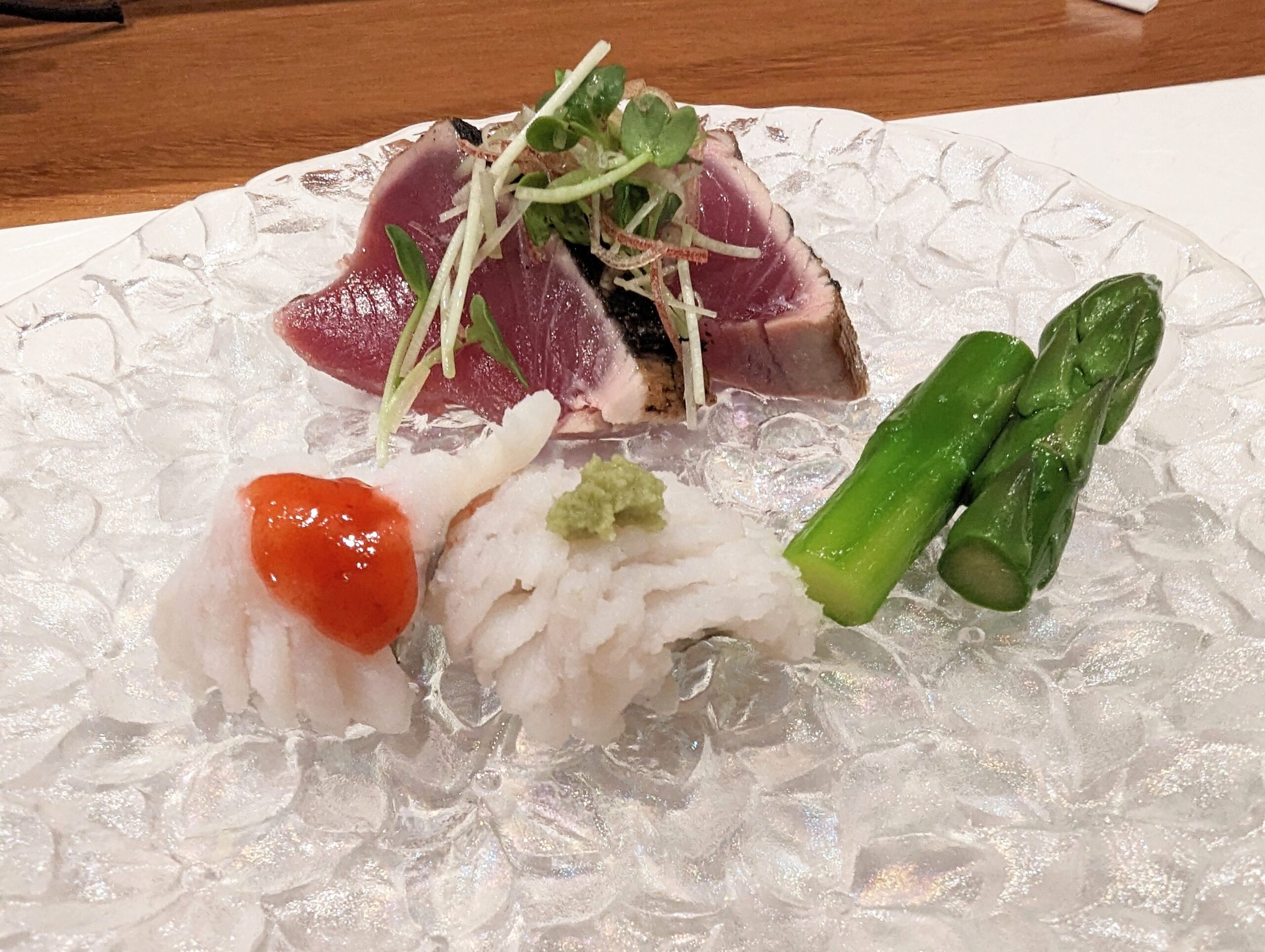 お刺身は**「鱧と鰹」**。付け合せにはアスパラ。
