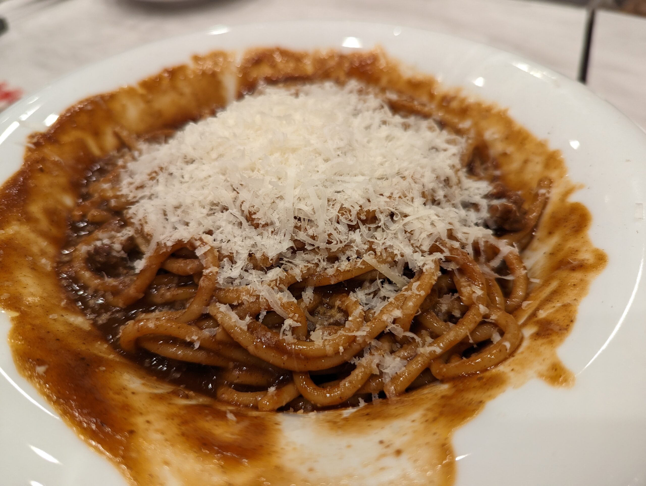 パスタの上に香ばしいハンバーグがのって出てきました。 店員さんが目の前で崩して、混ぜていただき、あっという間にミートソースに。 最後にチーズをたっぷりかけて完成。
