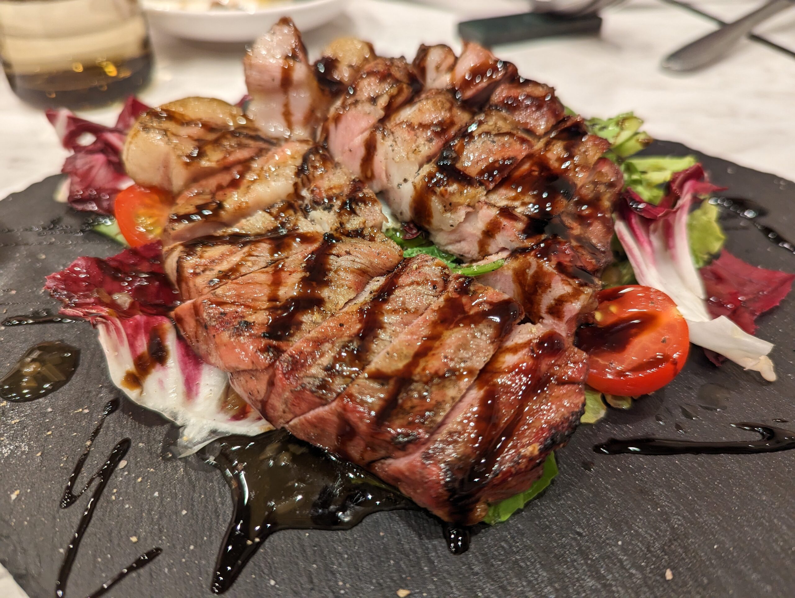 薪の香ばしさにバルサミコソースがお肉やお野菜を引き立ています。 お肉は甘みがあって柔らかく、とてもジューシーでした。