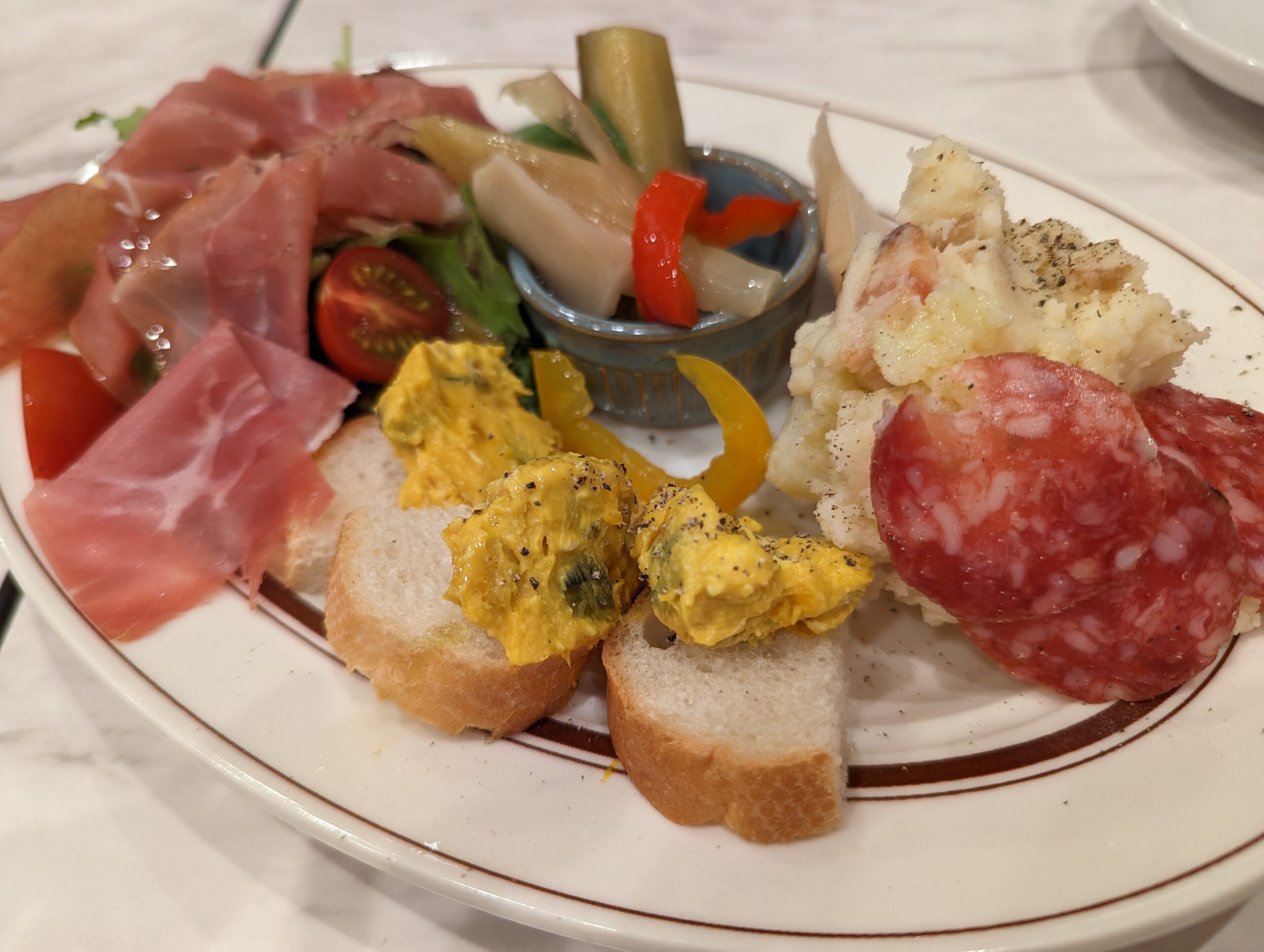 生ハムやサラダ、ピクルス、ポテトサラダなど。