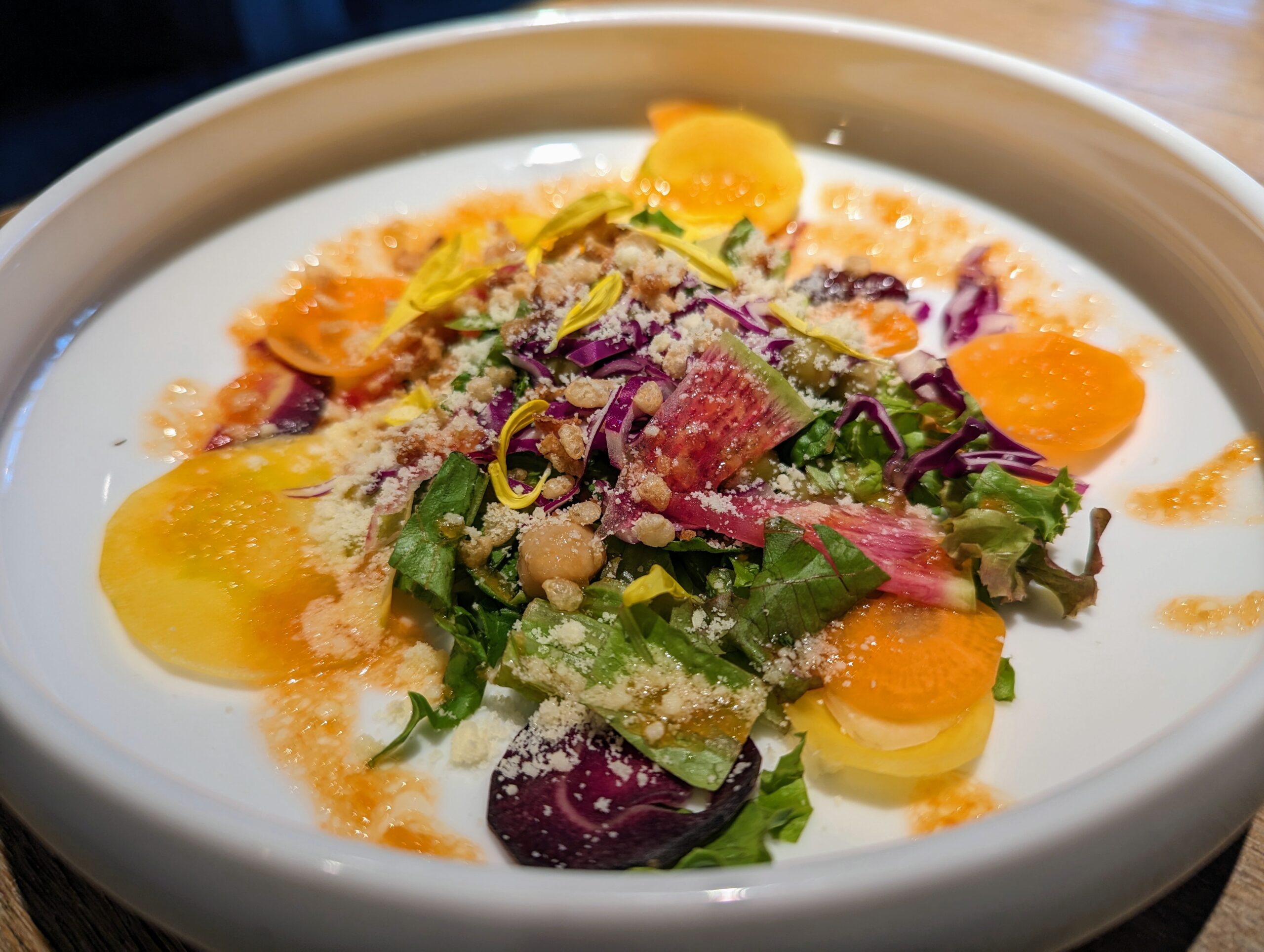 15品目の食材をを使い、見た目も華やかなサラダ。 最初の一皿のインパクトで女子たちが「わ〜」と盛り上がりました。 つかみはバッチリです。
