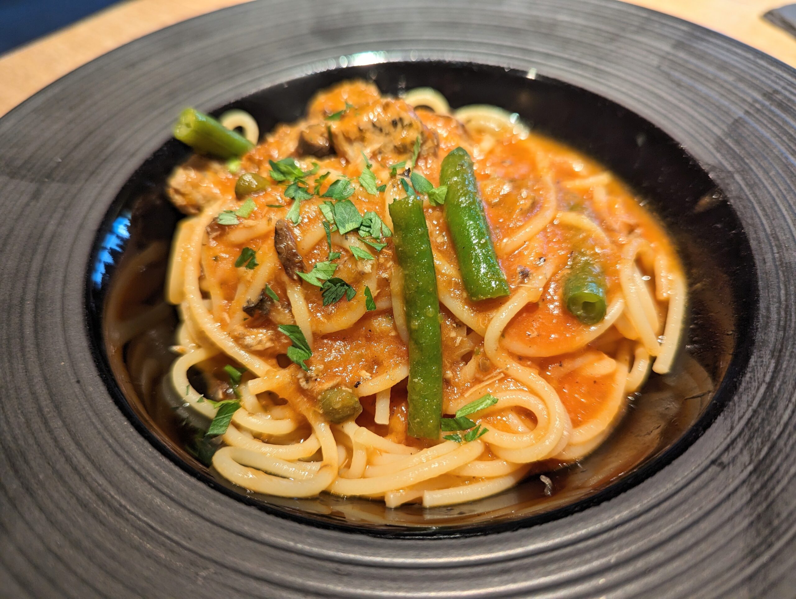 カツオとインゲンのプッタネスカトマトソース