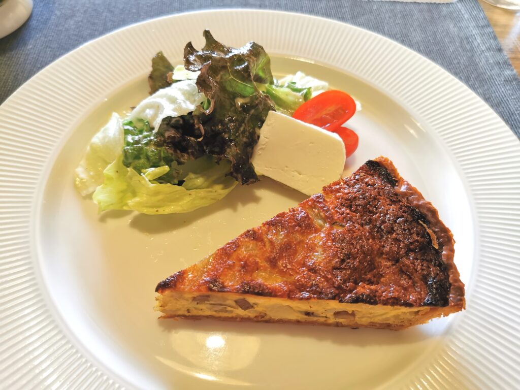焼きたてキッシュは熱々でサクサクで美味しい。 具材はきのこ、ベーコン、サトイモでした。 付け合わせにはサラダとモッツアレラチーズ。
