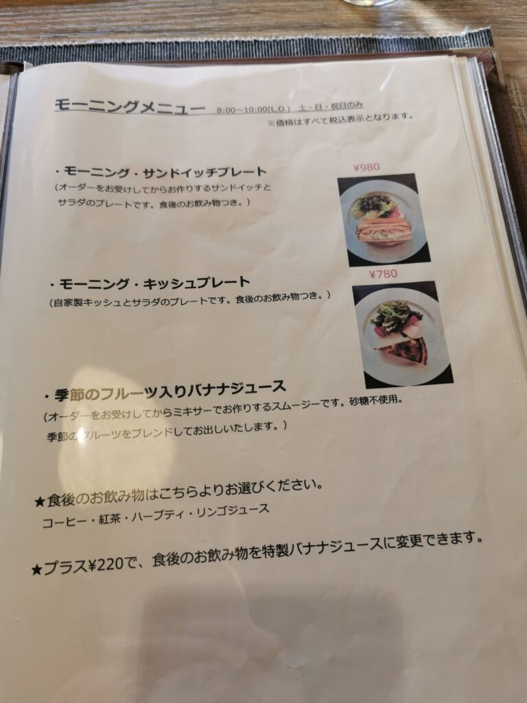 席について、メニューを拝見。 モーニングメニューはサンドイッチとキッシュの2種で飲み物付きです。 私はキッシュプレートをチョイスしました。
