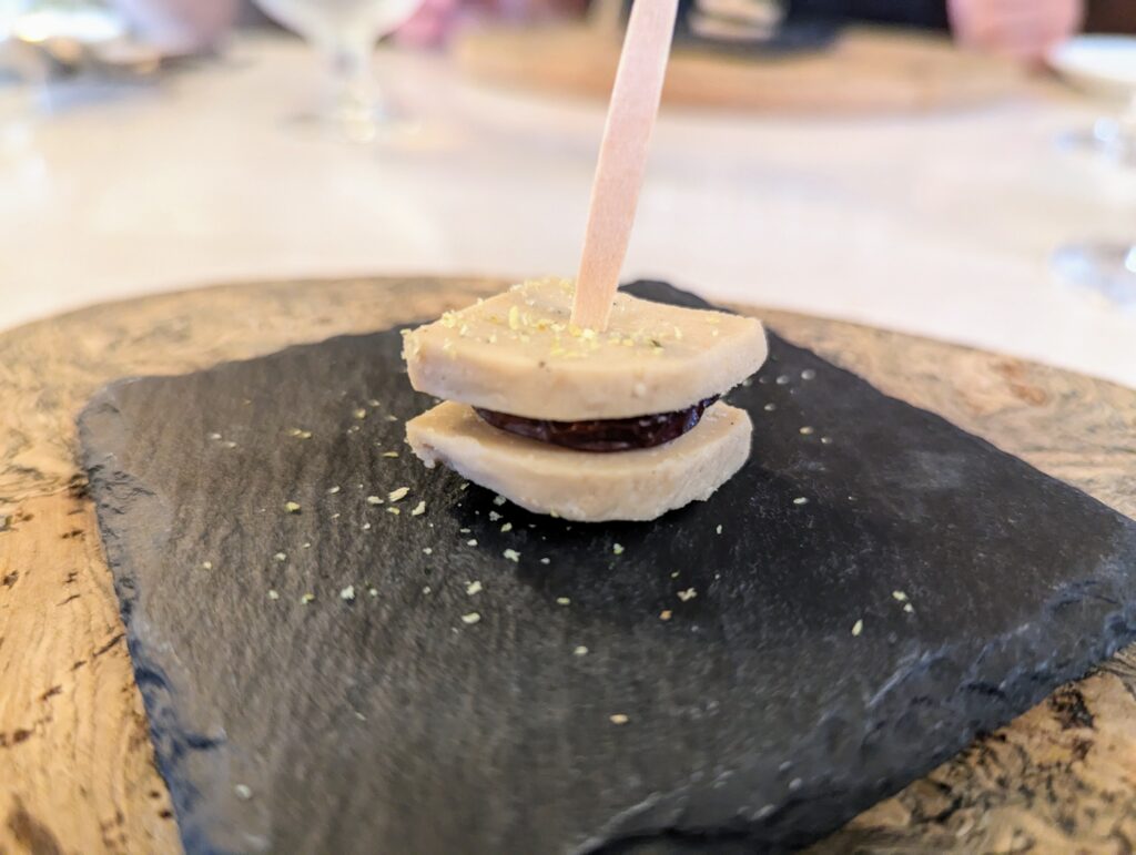 フォアグラ風ですが、植物性の素材を使った代替食品。 甘めのジャムが挟んであり、ワインに合う味。