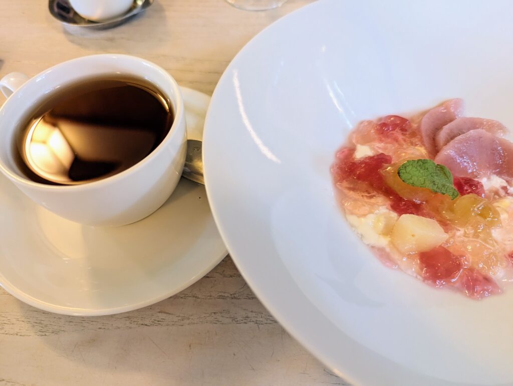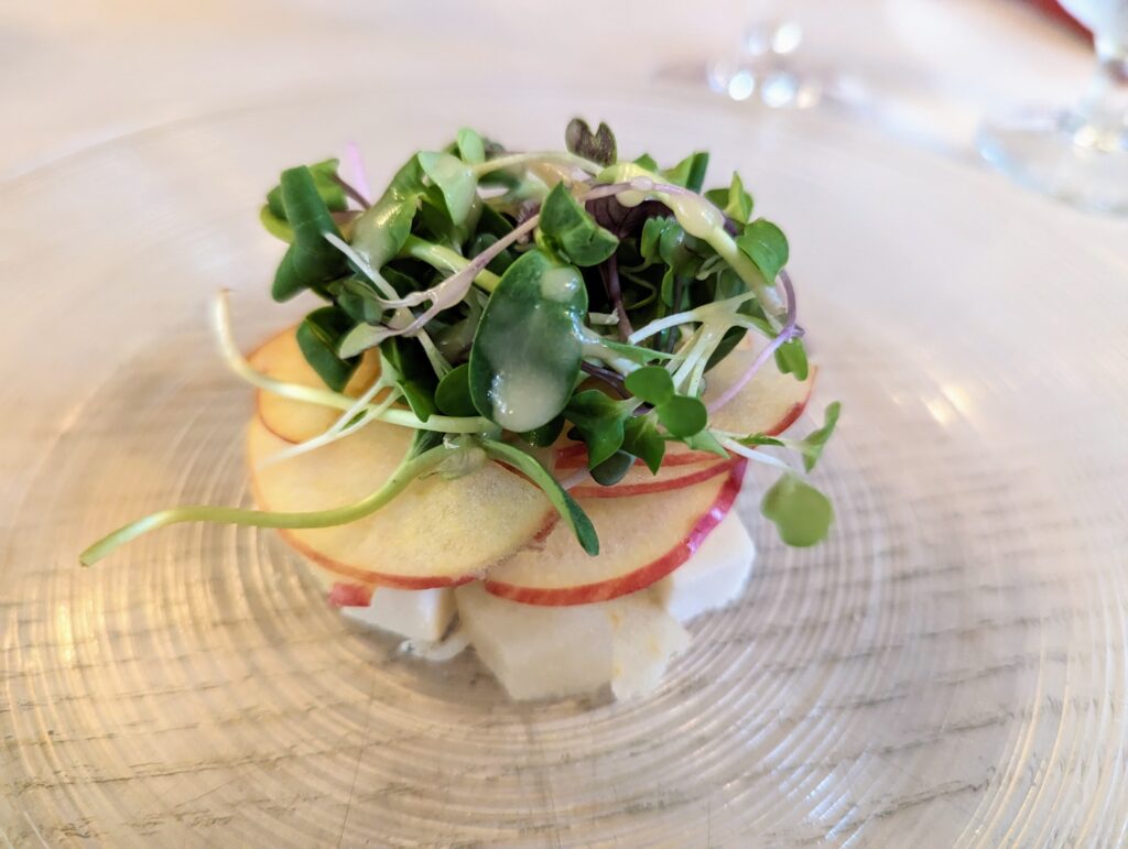 りんごとパンナコッタ。ジュレなども散りばめられて、見た目も綺麗。