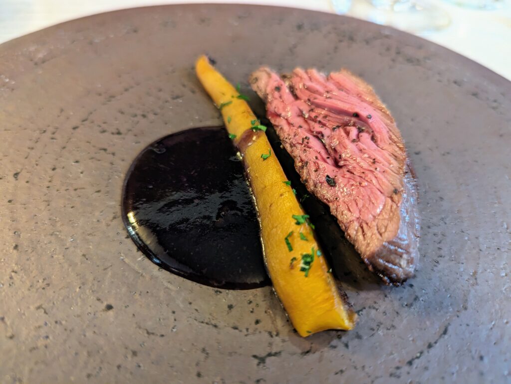 脂身の少ない赤身肉のグリル。 ローストされた人参とバルサミコの甘いソース、素材の味を最大限に引き出しています。