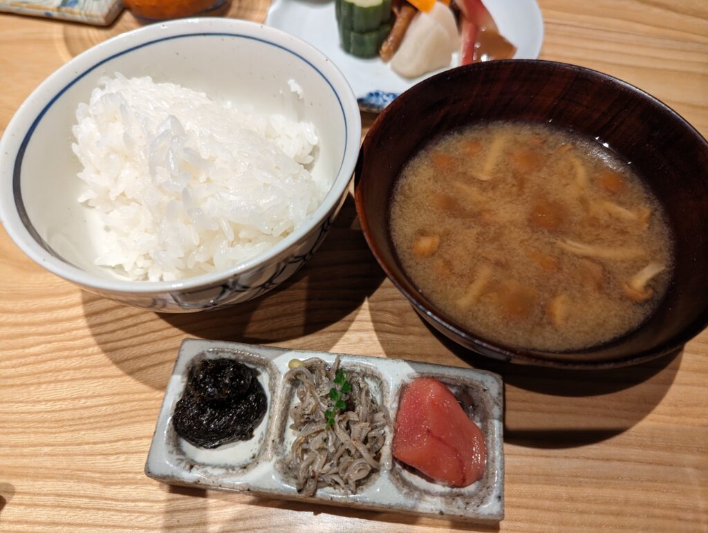 炊き立てのご飯がなんと無料でついてきます。 ピカピカのお米には、おかずの3種もりと味噌汁を。 シンプルに炊き立てのご飯の美味しさを引き立ててくれます。