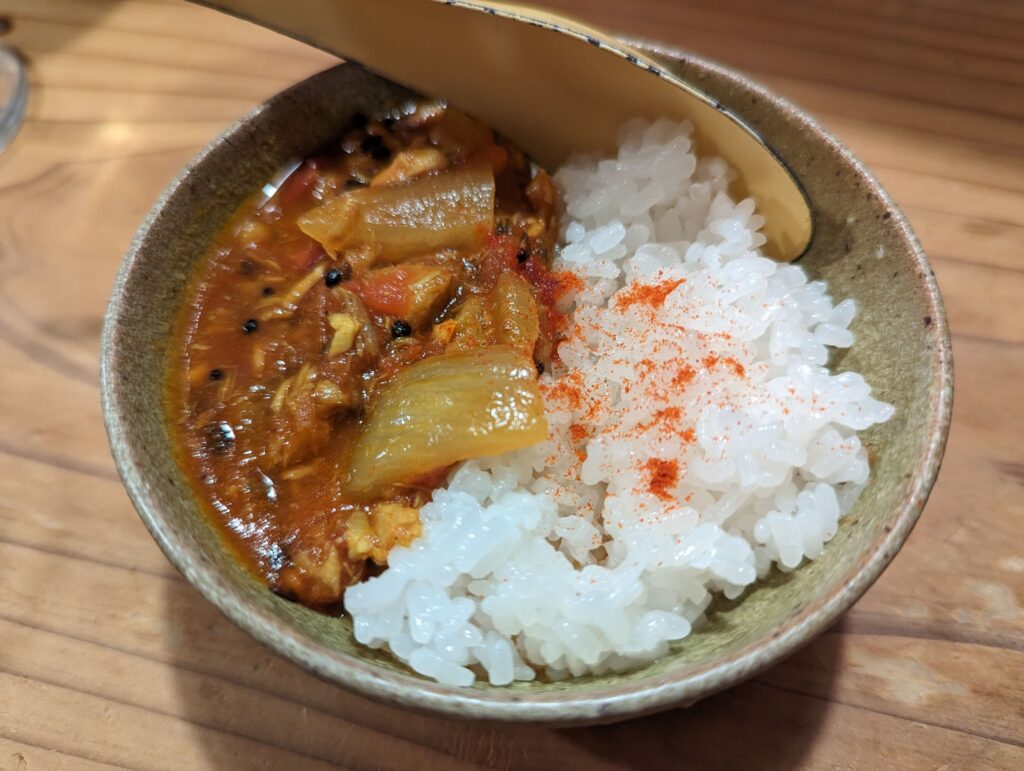 締めのところにスパイスカレーが2種類あり、サバトマトをハーフサイズでいただきました。 辛さ控えめの優しめの味わいで、もたれずサラリといただけます。