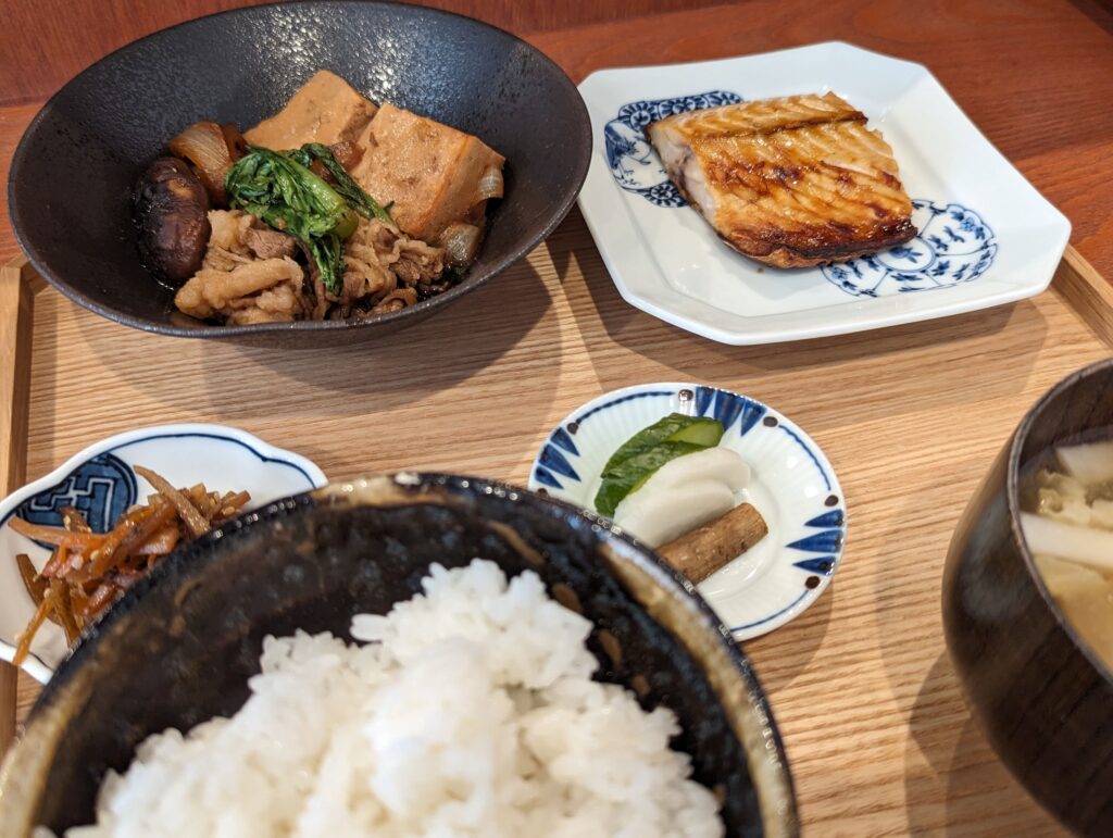 メインのおかずはさばの塩焼き、すき焼き風の煮込みの2品。 小鉢はきんぴらがついてきました。
