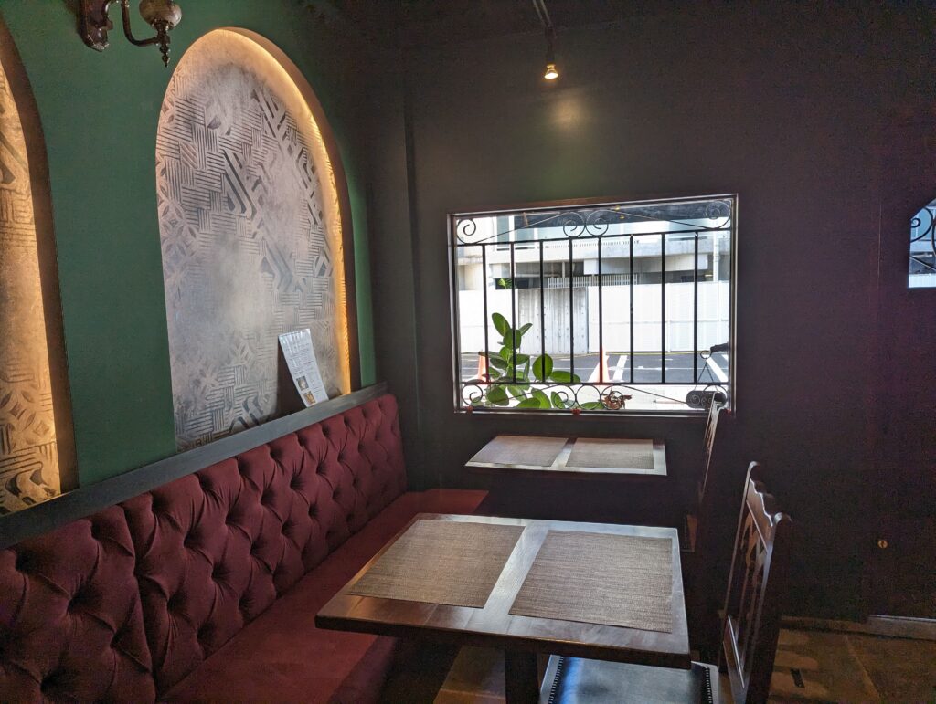 店内は深い緑の壁紙に赤褐色のソファー、クラシックで重厚感のある雰囲気。 とてもカッコいいですね。