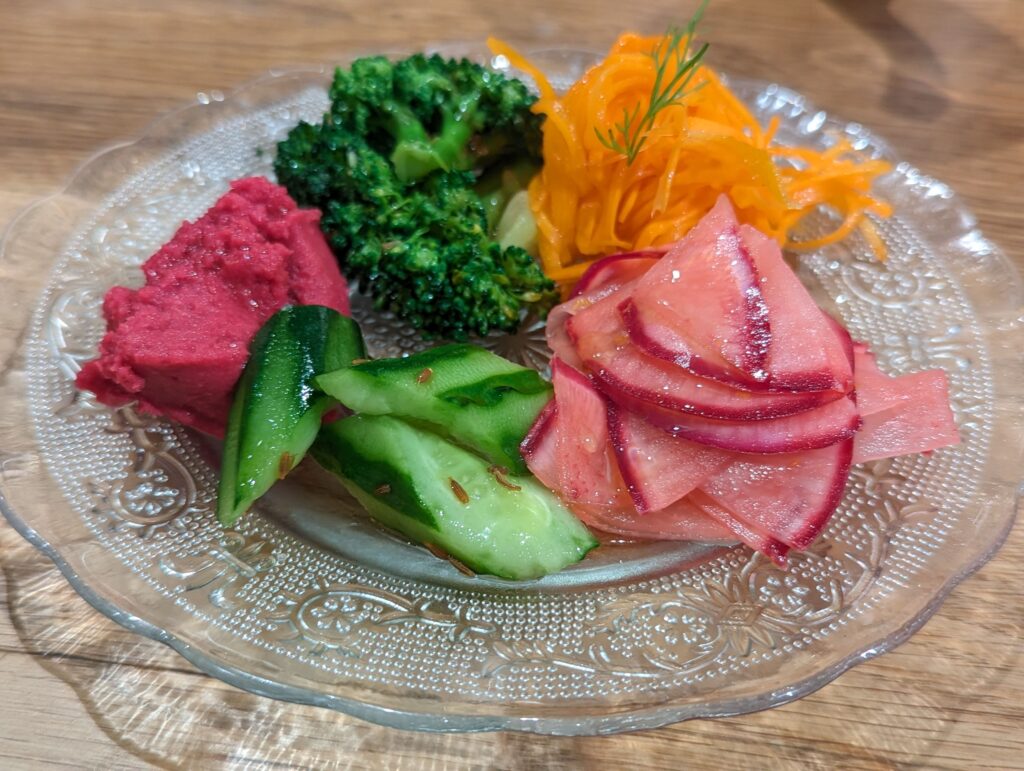 地元野菜を使った色とりどりの野菜たち。 人参、赤かぶ、ブロッコリー、ビーツ、胡瓜とお得な盛り合わせです。