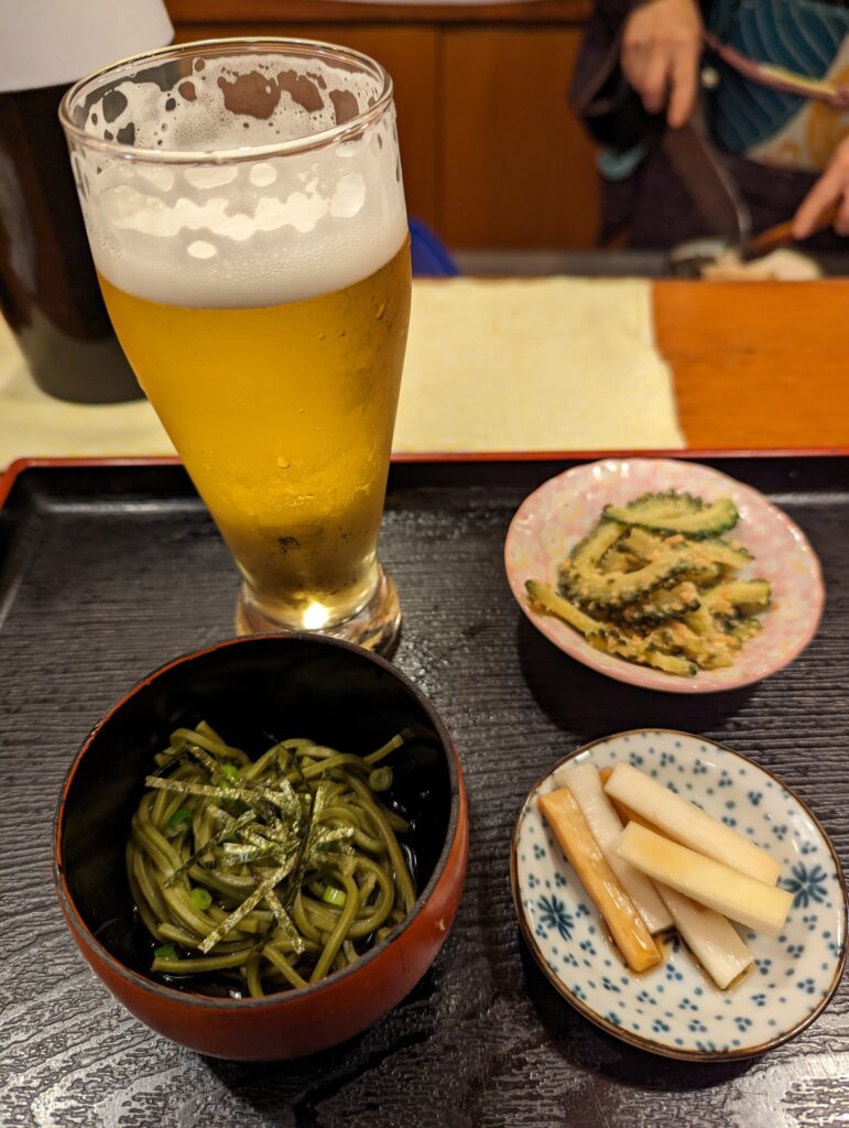 まずはお通しとビールで乾杯。 お通しは3品も!茶そばは食べた後におでんのスープを入れもらい、楽しみました。