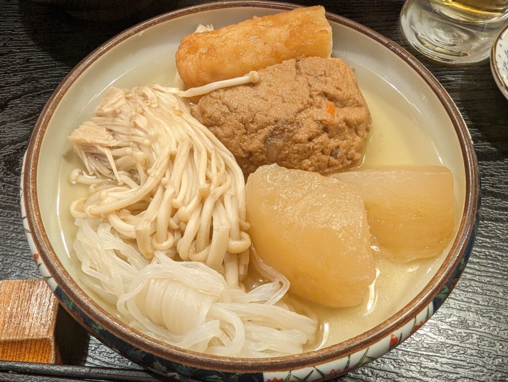 大根、つみれ、えのき、じゃがいも、こんにゃ、ごぼう天