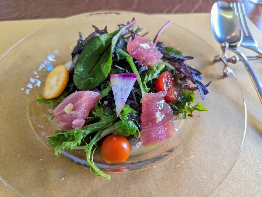 この日のカルパッチョはカジキマグロ。 金柑やトマト、葉物野菜、ハーブなどいろいろな味が楽しめます。