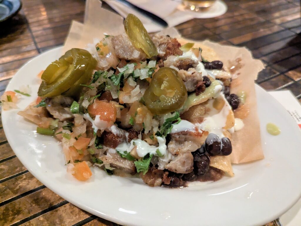 ポーク・チーズ・玉ねぎ、トマトなど野菜の組み合わせ。お通しのお豆も入っていました。 アクセントにハラペーニョの酢漬けと色々な味が楽しめます。