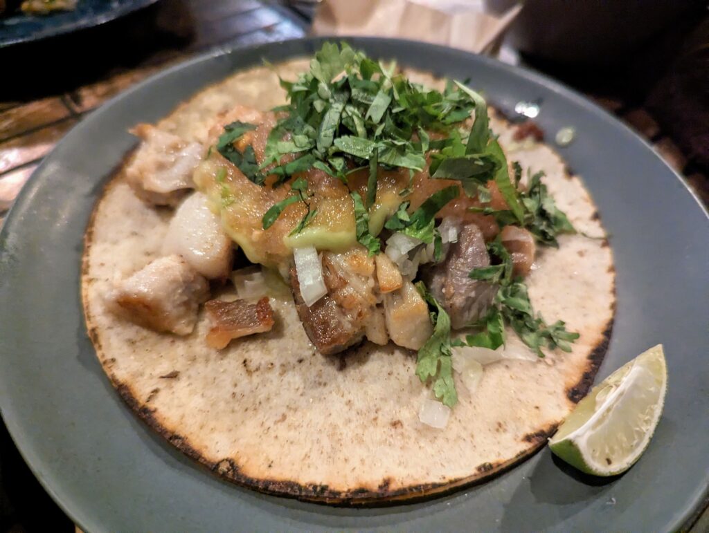 そしてメインのタコス。 トルティーヤはコーントルティーヤ(トウモロコシベース)とフラワートルティーヤ(小麦ベース)2種類から選べます。