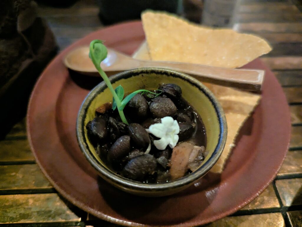 トルティーヤチップスにビーンズと豚肉を煮込んだもの。優しい味付け。