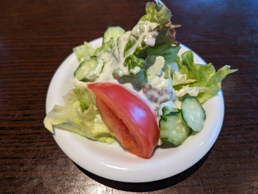 まず最初に出てきたのがサラダ。ドレッシングはフレンチドレッシングです!
