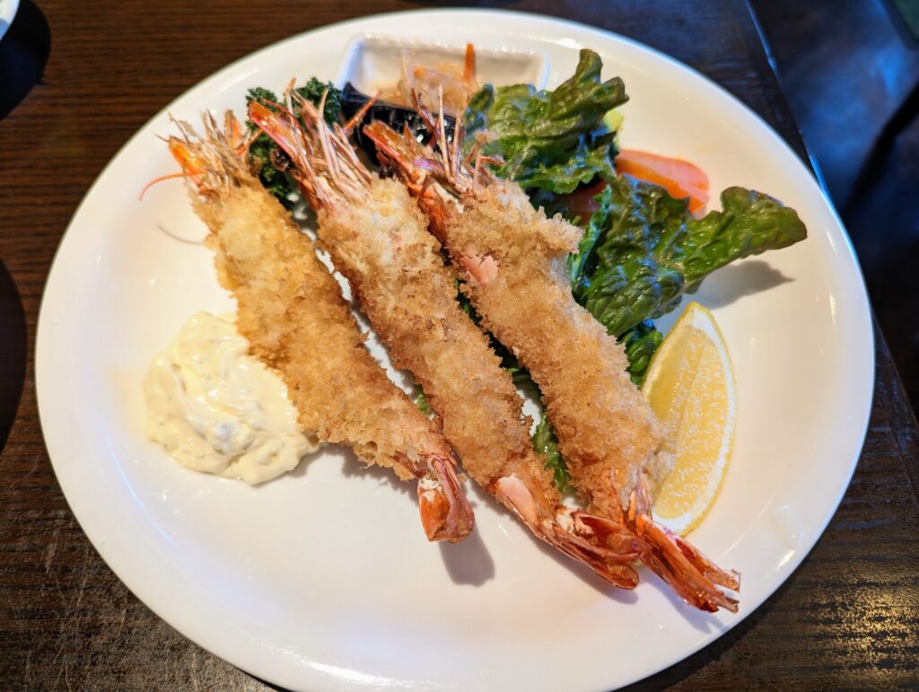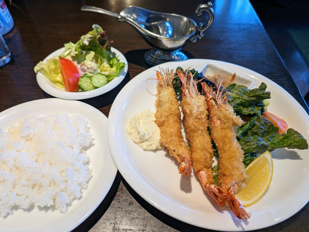 メインのエビフライはなんとお頭付きで3本も! ソースはタルタルソースとウスターソースの2種類。 サクサクの衣に旨味の詰まったエビ、レモンも絞って爽やかにいただきました。